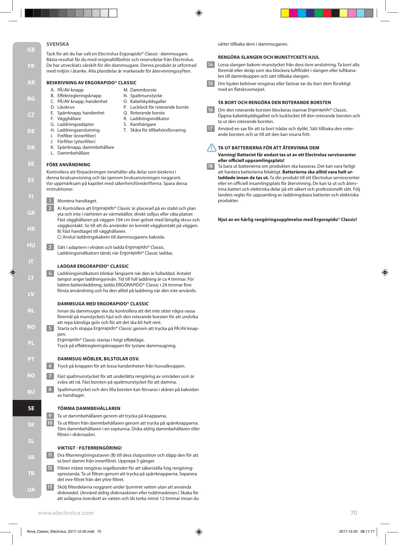 GB FR AR BG CZ DE DK EE ES FI GR SVENSKA Tack för att du har valt en Electrolux Ergorapido® Classic -dammsugare. Bästa resultat får du med originaltillbehör och reservdelar från Electrolux. De har utvecklats särskilt för din dammsugare. Denna produkt är utformad med miljön i åtanke. Alla plastdelar är markerade för återvinningssyften.