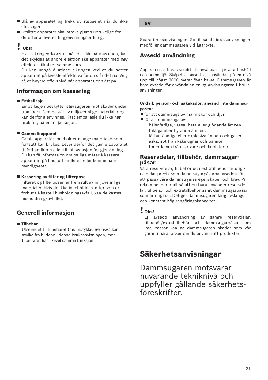 Spara bruksanvisningen. Se till så att bruksanvisningen medföljer dammsugaren vid ägarbyte. Avsedd användning Apparaten är bara avsedd att användas i privata hushåll och hemmiljö. Skåpet är avsett att användas på en nivå upp till högst 2000 meter över havet. Dammsugaren är bara avsedd för användning enligt anvisningarna i bruksanvisningen. Undvik person- och sakskador, använd inte dammsugaren: för att dammsuga av människor och djur. för att dammsuga av: - hälsofarliga, vassa, heta eller glödande ämnen. - fuktiga eller flytande ämnen. - lättantändliga eller explosiva ämnen och gaser. - aska, sot från kakelugnar och pannor. - tonerdamm från skrivare och kopiatorer. Reservdelar, tillbehör, dammsugarpåsar Våra reservdelar, tillbehör och extratillbehör är originaldelar precis som dammsugarpåsarna avsedda för att passa våra dammsugares egenskaper och krav. Vi rekommenderar alltså att du bara använder reservdelar, tillbehör och extratillbehör samt dammsugarpåsar som är original. Det ger dammsugaren lång livslängd och konstant hög rengöringskapacitet. ! Obs! Ej avsedd användning av sämre reservdelar, tillbehör/extratillbehör och dammsugarpåsar som inte passar kan ge dammsugaren skador som vår garanti bara täcker om du använt rätt produkter. Säkerhetsanvisningar Dammsugaren motsvarar nuvarande tekniknivå och uppfyller gällande säkerhetsföreskrifter.