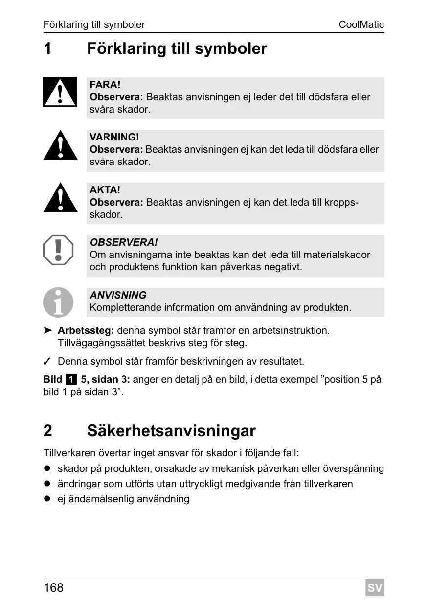 A I FARA! Observera: Beaktas anvisningen ej leder det till dödsfara eller svåra skador. VARNING! Observera: Beaktas anvisningen ej kan det leda till dödsfara eller svåra skador. AKTA! Observera: Beaktas anvisningen ej kan det leda till kroppsskador. OBSERVERA! Om anvisningarna inte beaktas kan det leda till materialskador och produktens funktion kan påverkas negativt. ANVISNING Kompletterande information om användning av produkten.