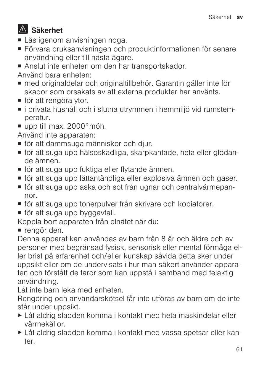 Säkerhet ¡ Läs igenom anvisningen noga. ¡ Förvara bruksanvisningen och produktinformationen för senare användning eller till nästa ägare. ¡ Anslut inte enheten om den har transportskador. Använd bara enheten: ¡ med originaldelar och originaltillbehör. Garantin gäller inte för skador som orsakats av att externa produkter har använts. ¡ för att rengöra ytor. ¡ i privata hushåll och i slutna utrymmen i hemmiljö vid rumstemperatur. ¡ upp till max. 2000°möh. Använd inte apparaten: ¡ för att dammsuga människor och djur. ¡ för att suga upp hälsoskadliga, skarpkantade, heta eller glödande ämnen. ¡ för att suga upp fuktiga eller flytande ämnen. ¡ för att suga upp lättantändliga eller explosiva ämnen och gaser. ¡ för att suga upp aska och sot från ugnar och centralvärmepannor. ¡ för att suga upp tonerpulver från skrivare och kopiatorer. ¡ för att suga upp byggavfall. Koppla bort apparaten från elnätet när du: ¡ rengör den. Denna apparat kan användas av barn från 8 år och äldre och av personer med begränsad fysisk, sensorisk eller mental förmåga eller brist på erfarenhet och/eller kunskap såvida detta sker under uppsikt eller om de undervisats i hur man säkert använder apparaten och förstått de faror som kan uppstå i samband med felaktig användning. Låt inte barn leka med enheten. Rengöring och användarskötsel får inte utföras av barn om de inte står under uppsikt. ▶ Låt aldrig sladden komma i kontakt med heta maskindelar eller värmekällor. ▶ Låt aldrig sladden komma i kontakt med vassa spetsar eller kanter. 61