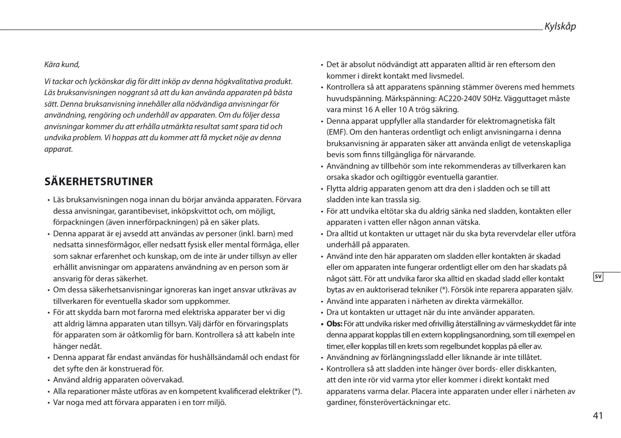 - Dopo la scadenza della garanzia le riparazione possono essere effettuata da un rivenditore autorizzato o dal servizio assistenza dietro pagamento. Linee guida per la protezione dell’ambiente Questo dispositivo non dovrebbe essere inserito nella spazzatura domestica alla fine del suo ciclo di vita, ma deve essere smaltito presso un punto centrale per il riciclo dei dispositivi domestici elettrici ed elettronici. Questo simbolo sul dispositivo, sul manuale d’istruzioni e sull’imballaggio centra la vostra attenzione su questo importante argomento. I materiali usati in questo dispositivo possono essere riciclati. Riciclando i dispositivi domestici usati contribuite a dare una spinta importante alla protezione del nostro ambiente. Chiedere alle autorità locali per informazioni inerenti i punti di raccolta. Imballaggio L’imballaggio è riciclabile al 100%, riportare l’imballaggio separatamente. Prodotto Questo dispositivo è dotato di un marchio secondo la Normativa Europea 2002/96/EC. sullo smaltimento dei rifiuti elettrici ed elettronici (WEEE). Garantendo che il prodotto viene correttamente smaltito come rifiuto, aiutate ad evitare conseguenze negative per l’ambiente e la salute umana. Dichiarazione di conformità EC Questo dispositivo è progettato, prodotto e marchiato secondo gli obiettivi di sicurezza della Direttiva sul Basso Consumo N° 2006/95/ EC, i requisiti di protezione della Direttiva EMC 2004/108/EC sulla "Compatibilità Elettromagnetica" e i requisiti della Direttiva 93/68/EEC. Kylskåp Kära kund, Vi tackar och lyckönskar dig för ditt inköp av denna högkvalitativa produkt. Läs bruksanvisningen noggrant så att du kan använda apparaten på bästa sätt. Denna bruksanvisning innehåller alla nödvändiga anvisningar för användning, rengöring och underhåll av apparaten. Om du följer dessa anvisningar kommer du att erhålla utmärkta resultat samt spara tid och undvika problem. Vi hoppas att du kommer att få mycket nöje av denna apparat. SÄKERHETSRUTINER