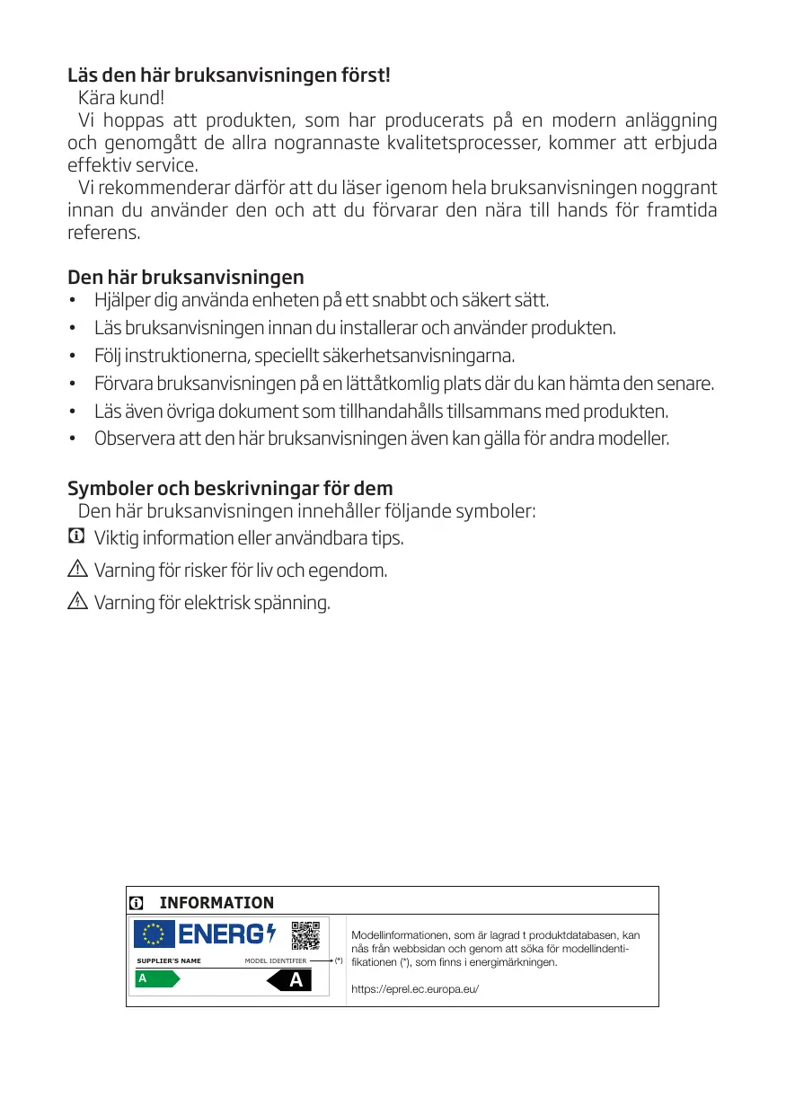 Modellinformationen, som är lagrad t produktdatabasen, kan nås från webbsidan och genom att söka för modellindentifikationen (*), som finns i energimärkningen. https://eprel.ec.europa.eu/