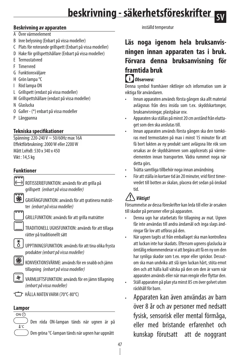 N’utilisez pas l’appareil si : Son cordon d’alimentation est défectueux L’appareil est tombé ou s’il présente des dégâts visibles ou des anomalies de fonctionnement. Le cas échéant, afin d’éviter tout risque, faites-le vérifier par le Centre de Service Après-vente le plus proche. N’installez pas l’appareil à proximité de sources de chaleur. N’utilisez pas l’appareil comme source de chaleur. Ne mettez jamais de papier, carton ou plastique dans le four et ne posez jamais rien dessus (ustensiles, grilles ou autres objets). N’introduisez rien dans les bouches de ventilation. Veillez à ne pas les obstruer. Ce four n’est pas conçu pour être encastré. Une fois la porte ouverte, n’y appuyez jamais des objets lourds, des casseroles ou récipients brûlants. Ne tirez pas la poignée vers le bas. La responsabilité du fabricant ne sera pas engagée en cas d’usage professionnel, non approprié ou non conforme au mode d’emploi, et la garantie sera annulée.