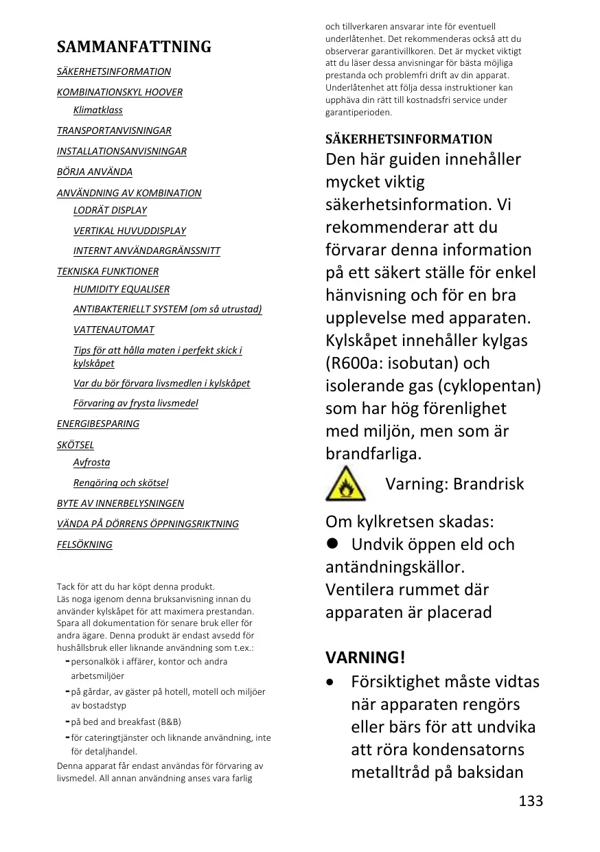 SÄKERHETSINFORMATION Den här guiden innehåller mycket viktig säkerhetsinformation. Vi rekommenderar att du förvarar denna information på ett säkert ställe för enkel hänvisning och för en bra upplevelse med apparaten. Kylskåpet innehåller kylgas (R600a: isobutan) och isolerande gas (cyklopentan) som har hög förenlighet med miljön, men som är brandfarliga. Varning: Brandrisk