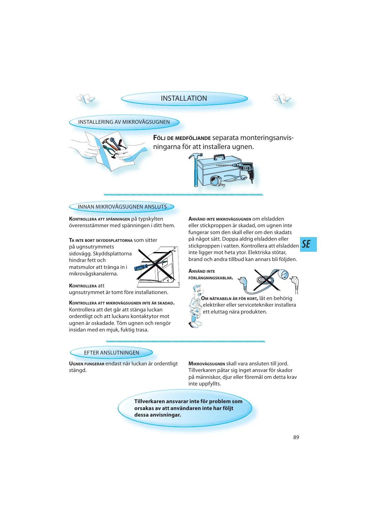 MIKROVÅGSUGNEN skall vara ansluten till jord. Tillverkaren påtar sig inget ansvar för skador på människor, djur eller föremål om detta krav inte uppfyllts.