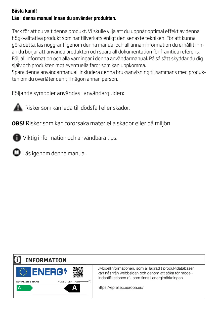 .Modellinformationen, som är lagrad t produktdatabasen, kan nås från webbsidan och genom att söka för modellindentifikationen (*), som finns i energimärkningen. https://eprel.ec.europa.eu/