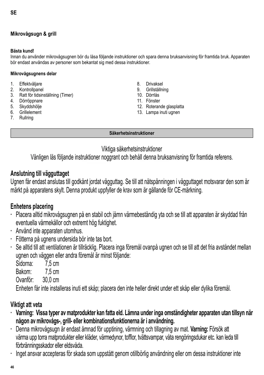 Drivaksel Grillställning Dörrlås Fönster Roterande glasplatta Lampa inuti ugnen Säkerhetsinstruktioner Viktiga säkerhetsinstruktioner Vänligen läs följande instruktioner noggrant och behåll denna bruksanvisning för framtida referens. Anslutning till vägguttaget Ugnen får endast anslutas till godkänt jordat vägguttag. Se till att nätspänningen i vägguttaget motsvarar den som är märkt på apparatens skylt. Denna produkt uppfyller de krav som är gällande för CE-märkning. Enhetens placering ∙ Placera alltid mikrovågsugnen på en stabil och jämn värmebeständig yta och se till att apparaten är skyddad från eventuella värmekällor och extremt hög fuktighet. ∙ Använd inte apparaten utomhus. ∙ Fötterna på ugnens undersida bör inte tas bort. ∙ Se alltid till att ventilationen är tillräcklig. Placera inga föremål ovanpå ugnen och se till att det fria avståndet mellan ugnen och väggen eller andra föremål är minst följande: Sidorna: 7,5 cm Bakom: 7,5 cm Ovanför: 30,0 cm Enheten får inte installeras inuti ett skåp; placera den inte heller direkt under ett skåp eller dylika föremål. Viktigt att veta ∙ Varning: Vissa typer av matprodukter kan fatta eld. Lämna under inga omständigheter apparaten utan tillsyn när någon av mikrovågs-, grill- eller kombinationsfunktionerna är i användning. ∙ Denna mikrovågsugn är endast ämnad för upptining, värmning och tillagning av mat. Varning: Försök att värma upp torra matprodukter eller kläder, värmedynor, tofflor, tvättsvampar, våta rengöringsdukar etc. kan leda till förbränningsskador eller eldsvåda. ∙ Inget ansvar accepteras för skada som uppstått genom otillbörlig användning eller om dessa instruktioner inte