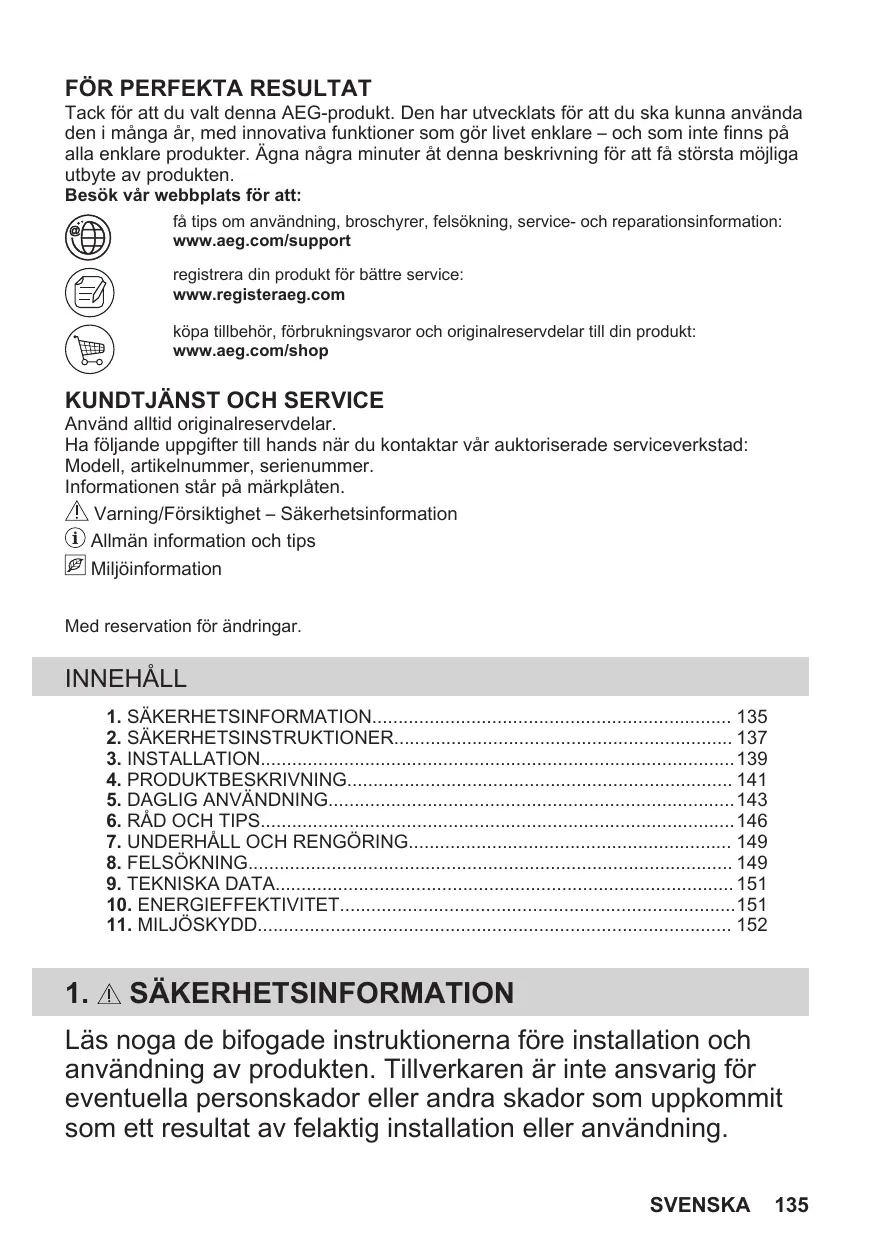 Tack för att du valt denna AEG-produkt. Den har utvecklats för att du ska kunna använda den i många år, med innovativa funktioner som gör livet enklare – och som inte finns på alla enklare produkter. Ägna några minuter åt denna beskrivning för att få största möjliga utbyte av produkten. Besök vår webbplats för att: få tips om användning, broschyrer, felsökning, service- och reparationsinformation: www.aeg.com/support registrera din produkt för bättre service: www.registeraeg.com köpa tillbehör, förbrukningsvaror och originalreservdelar till din produkt: www.aeg.com/shop