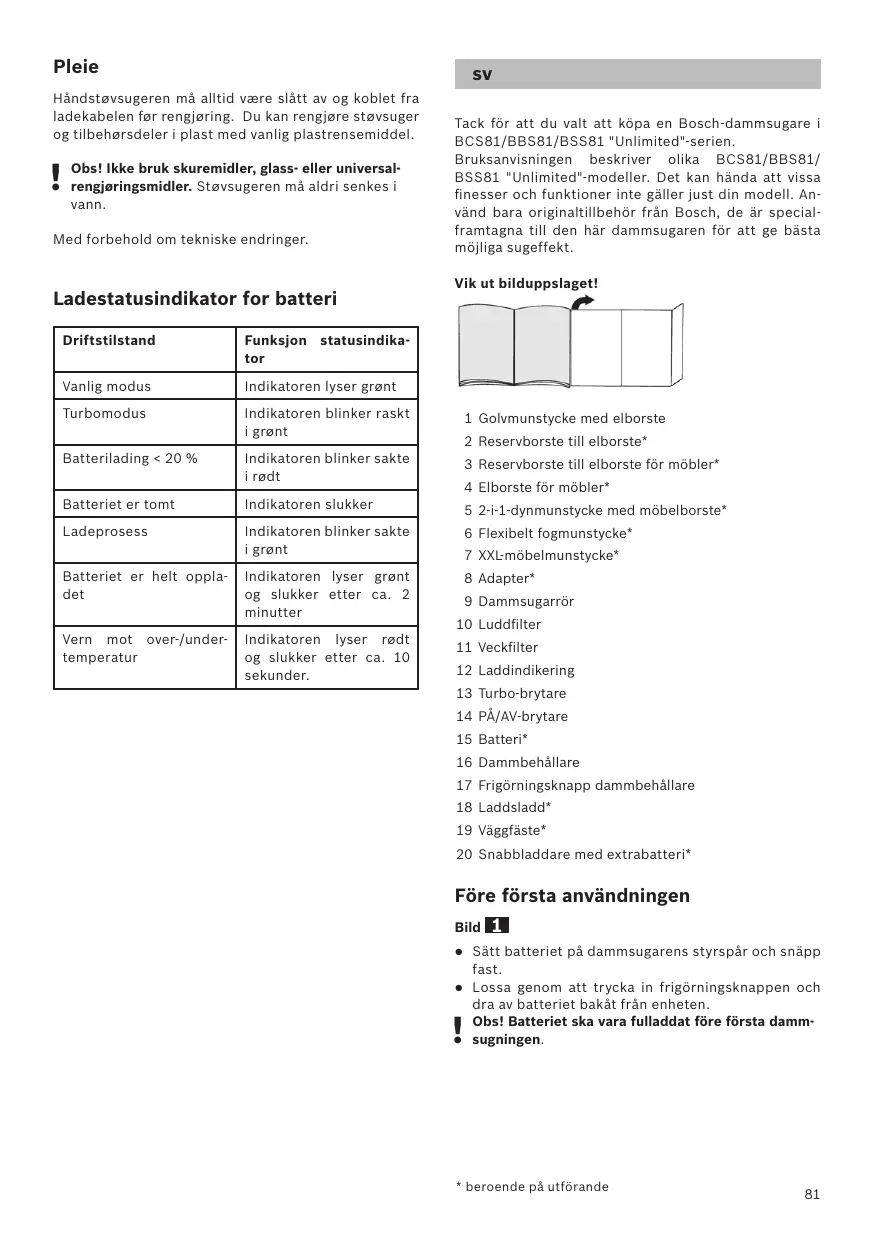 Tack fôr att du valt att kôpa en Bosch-dammsugare i BCS81/BBS81/BSS81 "Unlimited"-serien Bruksanvisningen beskriver olika BCS81/BBS81/ BSS81 "Unlimited"-modeller. Det kan hända att vissa finesser och funktioner inte gäller just din model. An- vänd bara originaltillbehôr frn Bosch, de är special- framtagna till den här dammsugaren fôr att ge bästa méiliga sugeffekt. Vik ut bilduppslaget! 1 Golvmunstycke med elborste 2 Reservborste till elborste* 3 Reservborste till elborste fôr môbler* 4 Elborste fôr môbler* 5 2-i-1-dynmunstycke med môbelborste* 6 Flexibelt fogmunstycke* 7 XXLmôbelmunstycke* 8 Adapter* 9 Dammsugarrër 10 Luddfiiter 11 Veckfilter 12 Laddindikering 13 Turbo-brytare 14 PÀ/AV-brytare 15 Batteri 16 Dammbehällare 17 Frigôrningsknapp dammbehällare 18 Laddsladd* 19 Väggfäste* 20 Snabbladdare med extrabatteri* Fôre fürsta användningen Bild EN Sätt batteriet pà dammsugarens styrspär och snäpp fast. Lossa genom att trycka in frigérningsknappen och dra av batteriet bakât frân enheten. Obs! Batteriet ska vara fulladdat fre férsta damm- sugningen.