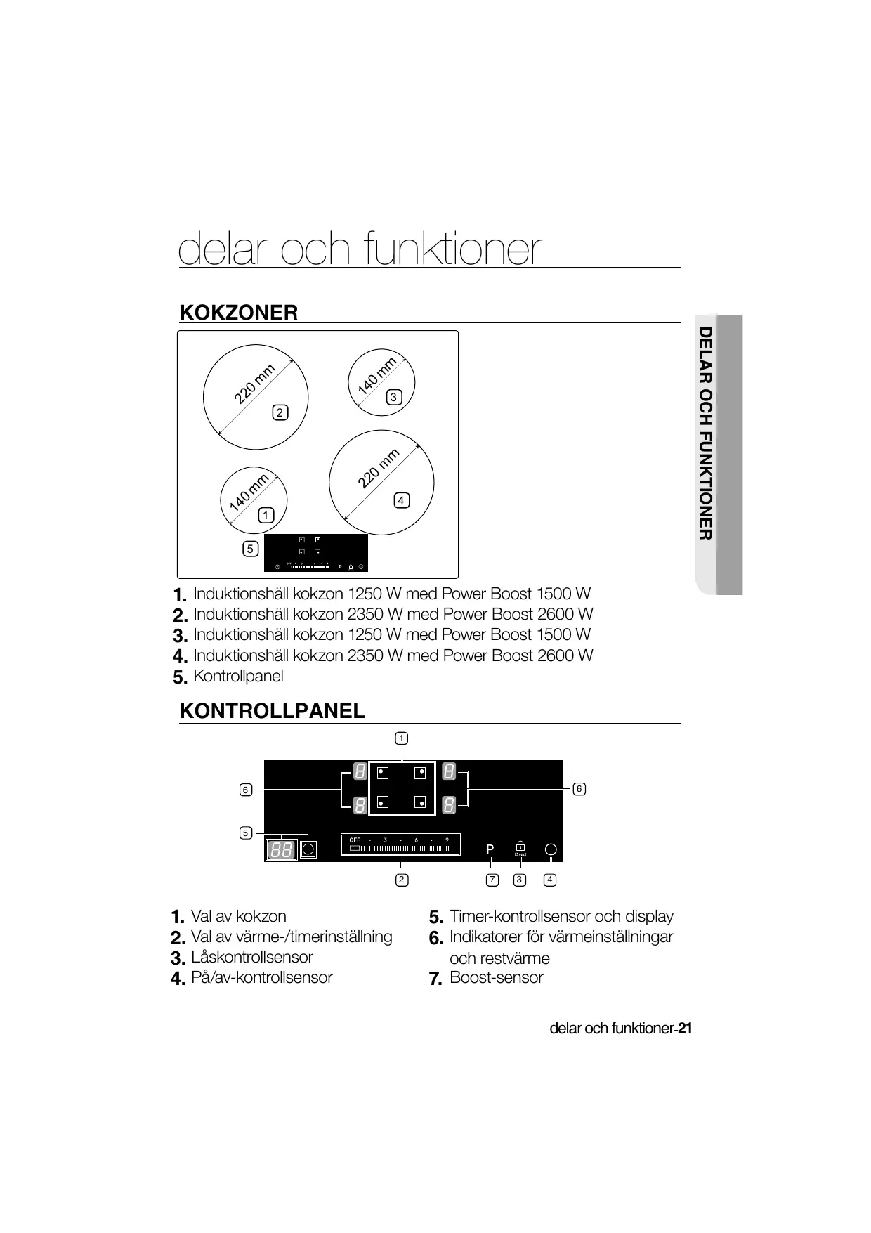 • Enkel rengöring: Fördelen med en kokyta och kontrollsensorer i keramiskt glas är att de är lätta att rengöra. Den släta, plana ytan är lätt att rengöra. • På/av-sensor: "På/Av"-sensorn ger apparaten en separat huvudströmbrytare. Genom att röra sensorn slås strömförsörjningen på eller stängs av helt. • Kontroll- och funktionsindikatorer: Digitala displayer och indikatorlampor ger information om inställningar och aktiverade funktioner, samt förekomsten av restvärme i de olika kokzonerna. • Säkerhetsavstängning: En säkerhetsbrytare säkerställer att värmezoner stängs av automatiskt efter en viss tid om inställningen inte har ändrats. • Indikator kvarvarande värme: En ikon för kvarvarande värme visas på skärmen om kokzonen är så pass varm att det finns risk för brännskador. • Power Boost : Använd denna funktion för att värma upp innehållet i grytan snabbare än den maximala effektnivån ' '. (Displayen visar ' '.) • Auto-detektering av kokkärl: Varje kokzon innehåller ett automatiskt system för detektering av kokkärl. Systemet är kalibrerat för att detektera kokkärl med en diameter aningen mindre än kokzonen. Kokkärl måste alltid placeras centralt på varje kokzon. Och du bör använda lämpliga köksredskap. • Digitala displayer: Fälten på displayen anger kokzonerna. De visar följande information