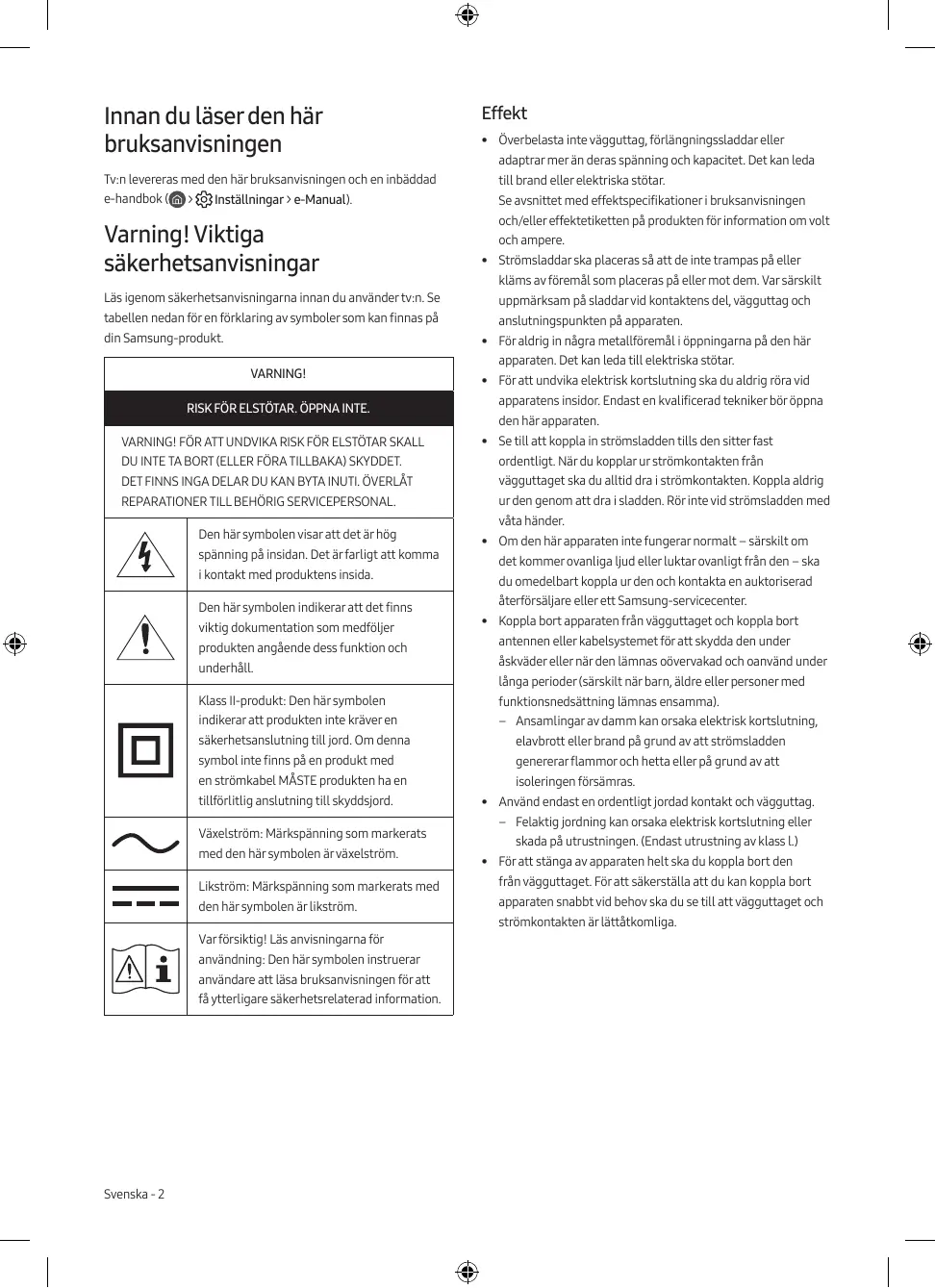Inställningar > e-Manual). Varning! Viktiga säkerhetsanvisningar Läs igenom säkerhetsanvisningarna innan du använder tv:n. Se tabellen nedan för en förklaring av symboler som kan finnas på din Samsung-produkt. och/eller effektetiketten på produkten för information om volt och ampere.