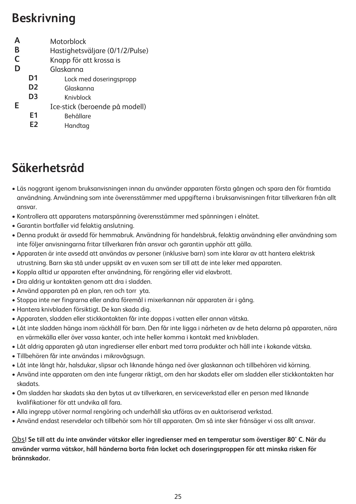 Säkerhetsråd • Läs noggrant igenom bruksanvisningen innan du använder apparaten första gången och spara den för framtida användning. Användning som inte överensstämmer med uppgifterna i bruksanvisningen fritar tillverkaren från allt ansvar. • Kontrollera att apparatens matarspänning överensstämmer med spänningen i elnätet. • Garantin bortfaller vid felaktig anslutning. • Denna produkt är avsedd för hemmabruk. Användning för handelsbruk, felaktig användning eller användning som inte följer anvisningarna fritar tillverkaren från ansvar och garantin upphör att gälla. • Apparaten är inte avsedd att användas av personer (inklusive barn) som inte klarar av att hantera elektrisk utrustning. Barn ska stå under uppsikt av en vuxen som ser till att de inte leker med apparaten. • Koppla alltid ur apparaten efter användning, för rengöring eller vid elavbrott. • Dra aldrig ur kontakten genom att dra i sladden. • Använd apparaten på en plan, ren och torr yta. • Stoppa inte ner fingrarna eller andra föremål i mixerkannan när apparaten är i gång. • Hantera knivbladen försiktigt. De kan skada dig. • Apparaten, sladden eller stickkontakten får inte doppas i vatten eller annan vätska. • Låt inte sladden hänga inom räckhåll för barn. Den får inte ligga i närheten av de heta delarna på apparaten, nära en värmekälla eller över vassa kanter, och inte heller komma i kontakt med knivbladen. • Låt aldrig apparaten gå utan ingredienser eller enbart med torra produkter och häll inte i kokande vätska. • Tillbehören får inte användas i mikrovågsugn. • Låt inte långt hår, halsdukar, slipsar och liknande hänga ned över glaskannan och tillbehören vid körning. • Använd inte apparaten om den inte fungerar riktigt, om den har skadats eller om sladden eller stickkontakten har skadats. • Om sladden har skadats ska den bytas ut av tillverkaren, en serviceverkstad eller en person med liknande kvalifikationer för att undvika all fara. • Alla ingrepp utöver normal rengöring och underhåll ska utföras av en auktoriserad verkstad. • Använd endast reservdelar och tillbehör som hör till apparaten. Om så inte sker frånsäger vi oss allt ansvar. Obs! Se till att du inte använder vätskor eller ingredienser med en temperatur som överstiger 80° C. När du använder varma vätskor, håll händerna borta från locket och doseringsproppen för att minska risken för brännskador.