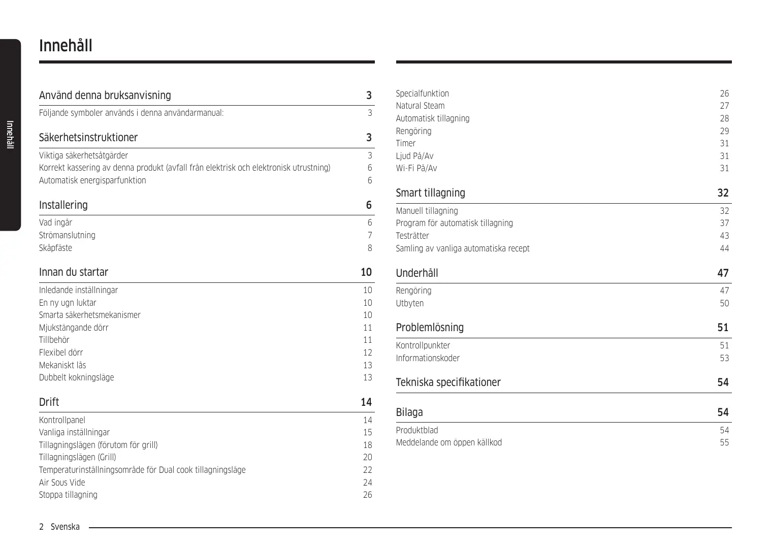 Innan du startar Inledande inställningar En ny ugn luktar Smarta säkerhetsmekanismer Mjukstängande dörr Tillbehör Flexibel dörr Mekaniskt lås Dubbelt kokningsläge Drift Kontrollpanel Vanliga inställningar Tillagningslägen (förutom för grill) Tillagningslägen (Grill) Temperaturinställningsområde för Dual cook tillagningsläge Air Sous Vide Stoppa tillagning 2 Svenska
