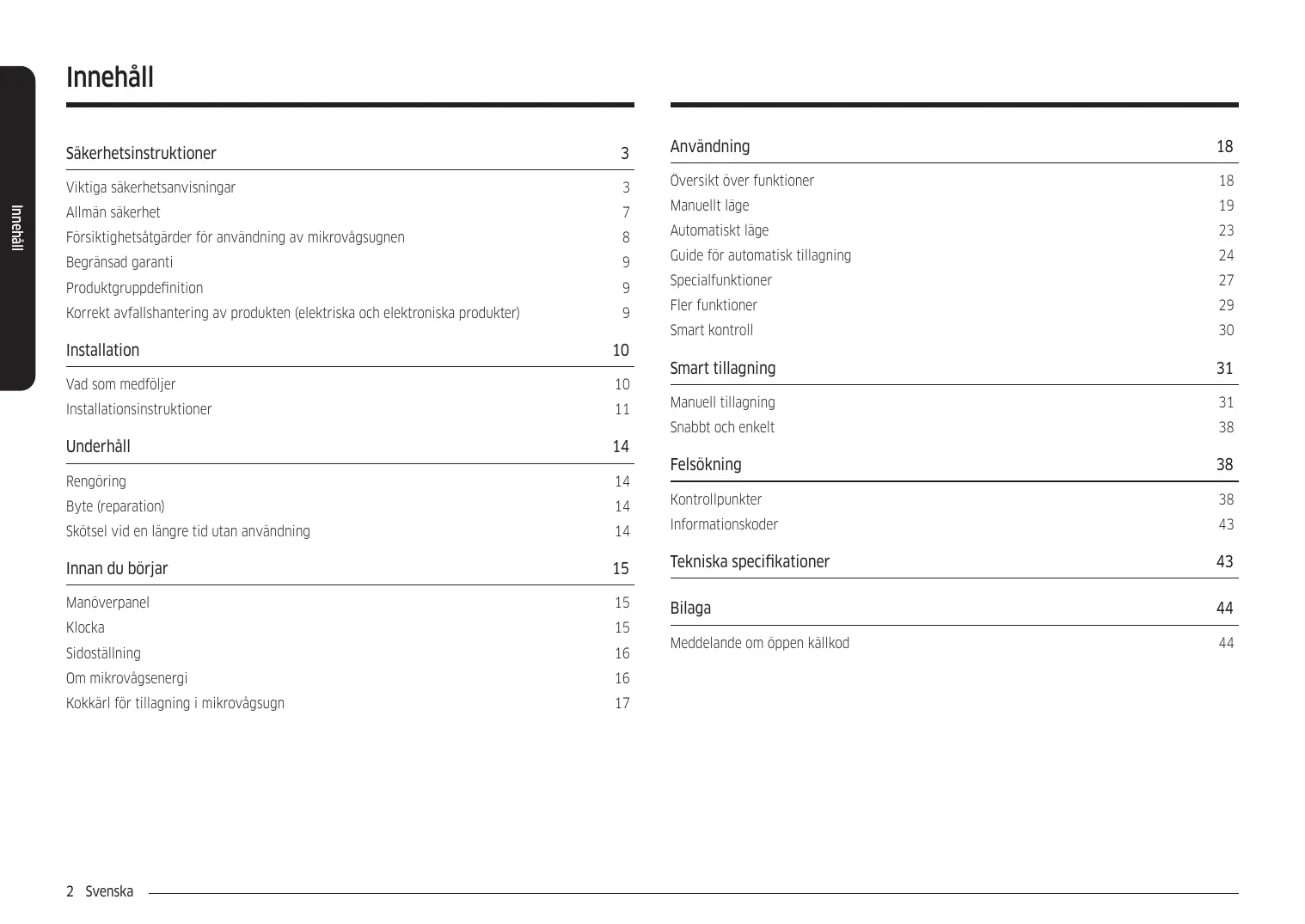 Ägg och äggskal samt hårdkoka ägg får inte värmas i mikrovågsugn, eftersom de kan explodera, även efter att värmeprocessen är klar. Ugnen skall rengöras regelbundet och alla matrester avlägsnas. Om ugnen inte hålls ren kan det leda till att ytan försämras vilket kan påverka apparaten negativt samt eventuellt leda till risker. Apparaten är endast avsedd att användas inbyggd. Apparaten ska inte placeras i ett skåp. Metalliska behållare för mat och dryck är inte tillåtet under tillagning i mikrovågsugn. Var försiktig så att du inte flyttar den roterande tallriken när du tar ut behållare från apparaten. (Endast modeller med roterande tallrik) Apparaten ska inte rengöras med en ångrengörare. Apparaten ska inte rengöras med en vattenstråle. Den här apparaten är inte avsedd för att installeras i fordon som körs på vägar, exempelvis husvagnar och liknande.