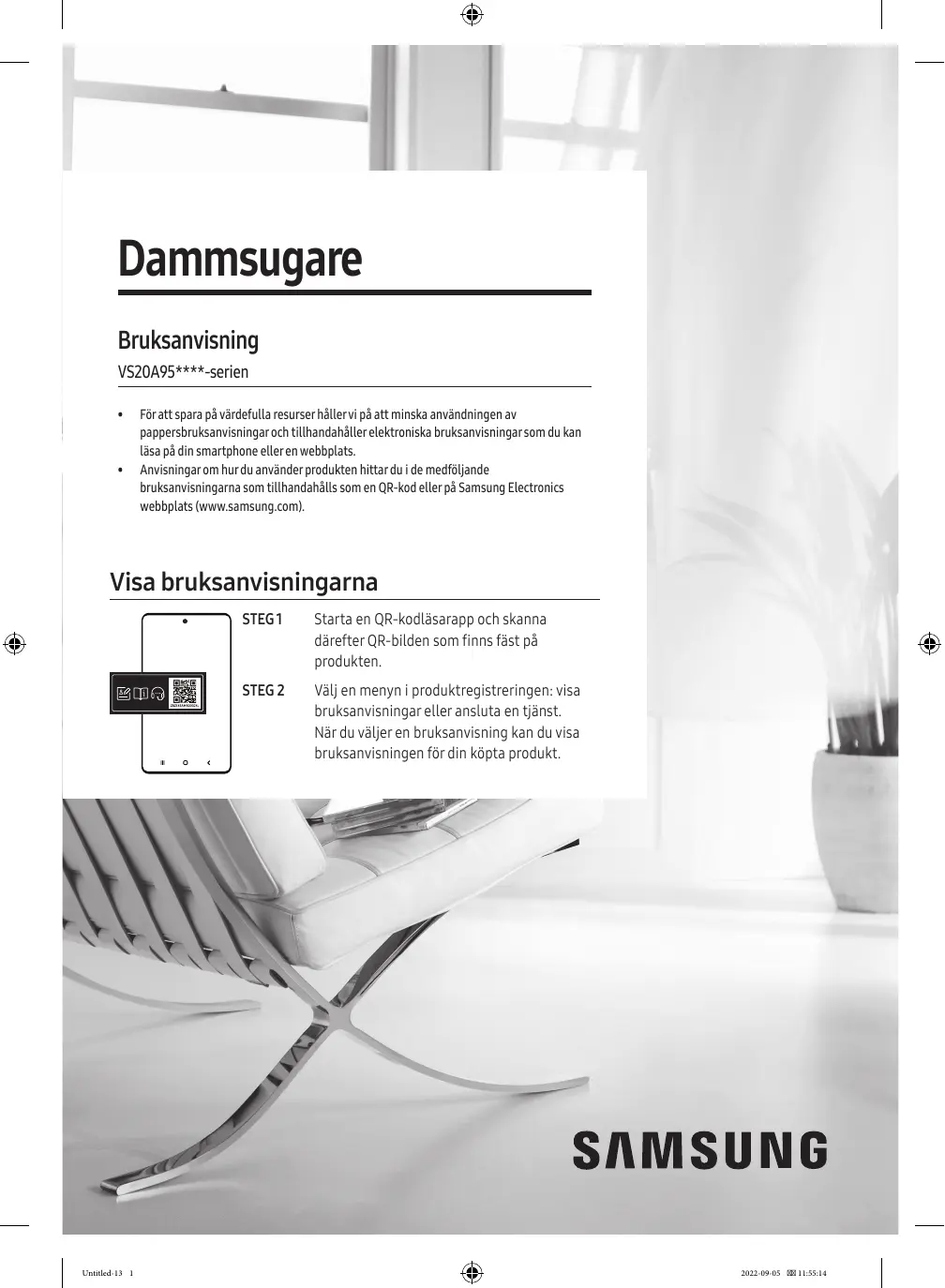 För att spara på värdefulla resurser håller vi på att minska användningen av pappersbruksanvisningar och tillhandahåller elektroniska bruksanvisningar som du kan läsa på din smartphone eller en webbplats. Anvisningar om hur du använder produkten hittar du i de medföljande bruksanvisningarna som tillhandahålls som en QR-kod eller på Samsung Electronics webbplats (www.samsung.com). Visa bruksanvisningarna Untitled-13 1 STEG 1 Starta en QR-kodläsarapp och skanna därefter QR-bilden som finns fäst på produkten. STEG 2 Välj en menyn i produktregistreringen: visa bruksanvisningar eller ansluta en tjänst. När du väljer en bruksanvisning kan du visa bruksanvisningen för din köpta produkt. 2022-09-05 11:55:14 Säkerhetsinformation Säkerhetsinformation
