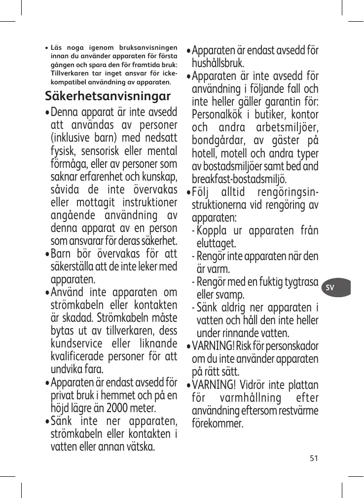 • Apparaten är endast avsedd för hushållsbruk. • Apparaten är inte avsedd för användning i följande fall och inte heller gäller garantin för: Personalkök i butiker, kontor och andra arbetsmiljöer, bondgårdar, av gäster på hotell, motell och andra typer av bostadsmiljöer samt bed and breakfast-bostadsmiljö. • Följ alltid rengöringsinstruktionerna vid rengöring av apparaten: - Koppla ur apparaten från eluttaget. - Rengör inte apparaten när den är varm. - Rengör med en fuktig tygtrasa eller svamp. - Sänk aldrig ner apparaten i vatten och håll den inte heller under rinnande vatten. • VARNING! Risk för personskador om du inte använder apparaten på rätt sätt. • VARNING! Vidrör inte plattan för varmhållning efter användning eftersom restvärme förekommer. 51