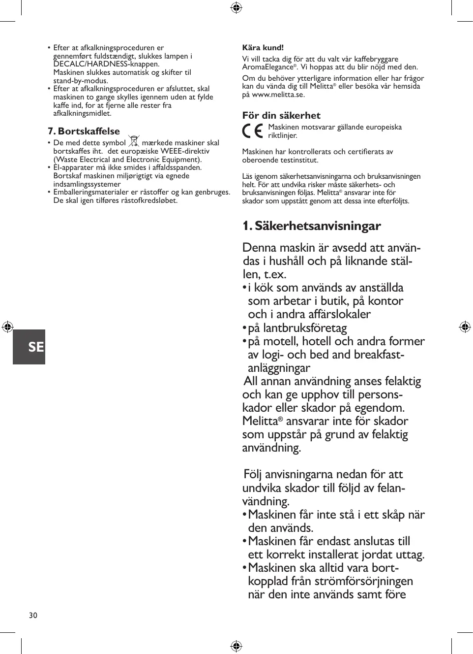 För din säkerhet Maskinen motsvarar gällande europeiska riktlinjer. Maskinen har kontrollerats och certifierats av oberoende testinstitut. Läs igenom säkerhetsanvisningarna och bruksanvisningen helt. För att undvika risker måste säkerhets- och bruksanvisningen följas. Melitta® ansvarar inte för skador som uppstått genom att dessa inte efterföljts.