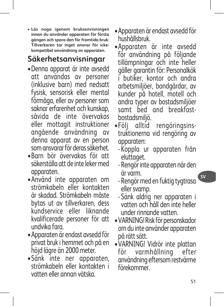 • Apparaten är endast avsedd för hushållsbruk. • Apparaten är inte avsedd för användning på följande tillämpningar och inte heller gäller garantin för: Personalkök i butiker, kontor och andra arbetsmiljöer, bondgårdar, av kunder på hotell, motell och andra typer av bostadsmiljöer samt bed and breakfastbostadsmiljö. • Följ alltid rengöringsinstruktionerna vid rengöring av apparaten: - Koppla ur apparaten från eluttaget. - Rengör inte apparaten när den är varm. - Rengör med en fuktig tygtrasa eller svamp. - Sänk aldrig ner apparaten i vatten och håll den inte heller under rinnande vatten. • VARNING! Risk för personskador om du inte använder apparaten på rätt sätt. • VARNING! Vidrör inte plattan för varmhållning efter användning eftersom restvärme förekommer. 51