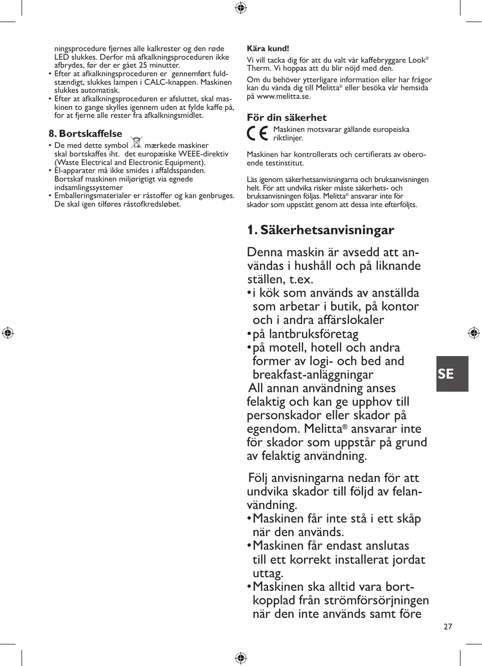 L‘appareil est conforme aux normes européennes en vigueur. L‘appareil a été contrôlé et certifié par des instituts de tests indépendants. Veuillez lire les consignes de sécurité et le mode d‘emploi dans leur intégralité. Afin d‘éviter tout danger, respectez les consignes de sécurité ainsi que le mode d‘emploi. Melitta® décline toute responsabilité en cas de dommages résultant d‘un non-respect des consignes.