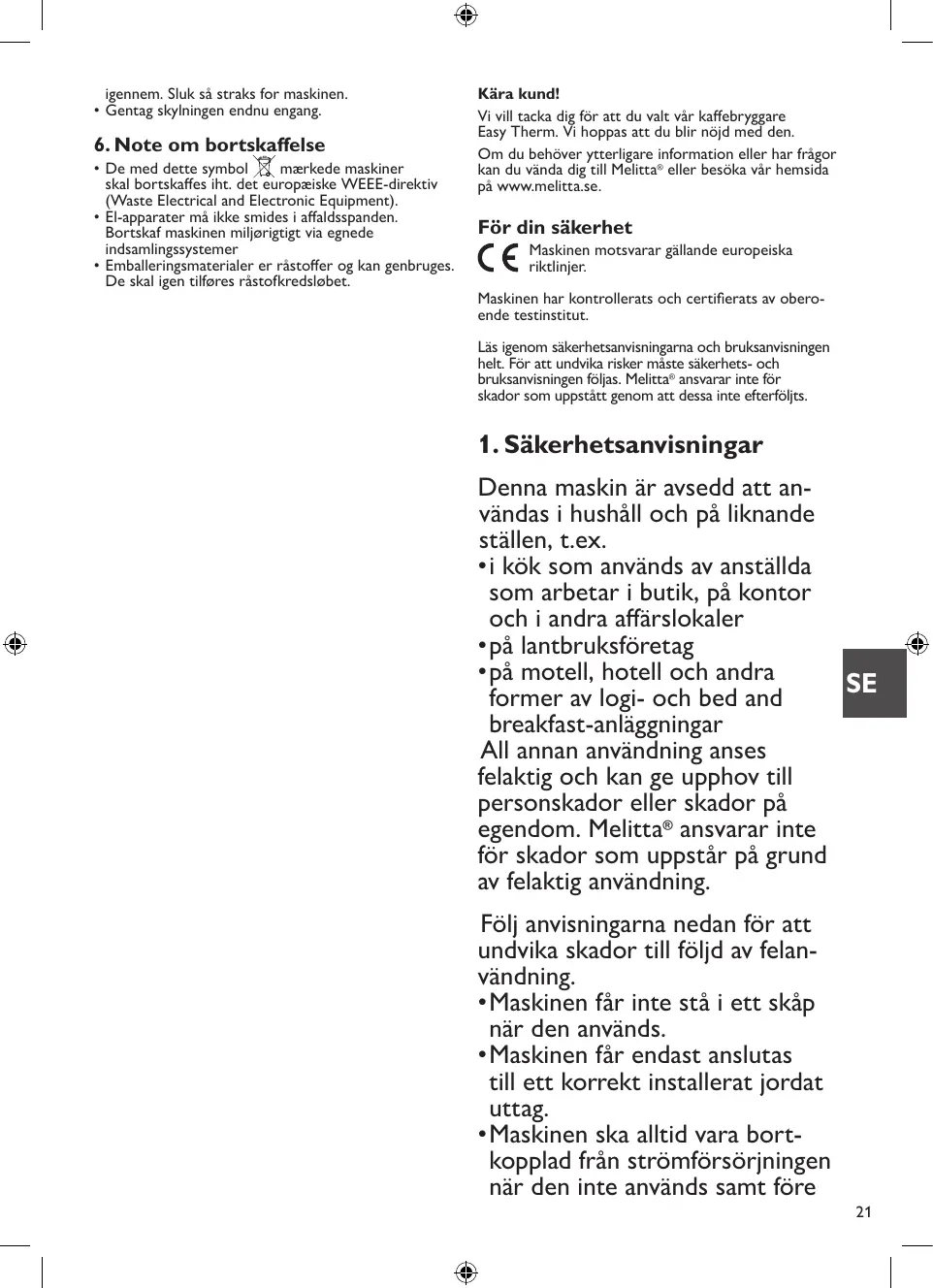 1. Säkerhetsanvisningar Denna maskin är avsedd att användas i hushåll och på liknande ställen, t.ex. • i kök som används av anställda som arbetar i butik, på kontor och i andra affärslokaler • på lantbruksföretag • på motell, hotell och andra SE former av logi- och bed and breakfast-anläggningar All annan användning anses felaktig och kan ge upphov till personskador eller skador på egendom. Melitta® ansvarar inte för skador som uppstår på grund av felaktig användning. Följ anvisningarna nedan för att undvika skador till följd av felanvändning. • Maskinen får inte stå i ett skåp när den används. • Maskinen får endast anslutas till ett korrekt installerat jordat uttag. • Maskinen ska alltid vara bortkopplad från strömförsörjningen när den inte används samt före 21