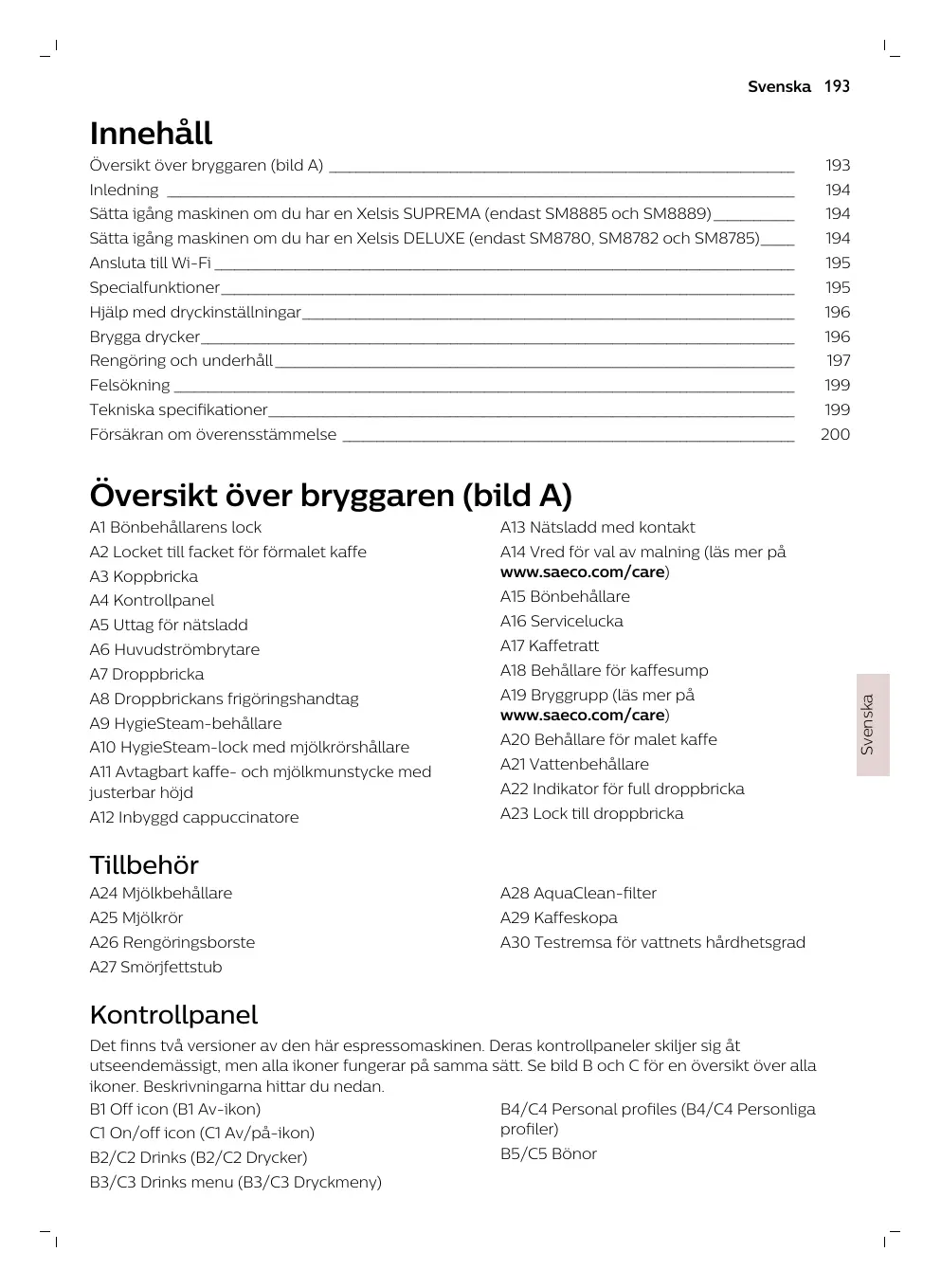 Felsökning För att du ska kunna lösa de vanligaste problemen som kan uppstå när du använder maskinen erbjuder Saeco support på flera sätt: - du kan hitta steg för steg-videor på maskinens kontrollpanel - instruktionsvideor och en fullständig lista över vanliga frågor finns på www.saeco.com/care - på www.saeco.com/care hittar du även den utökade versionen av användarhandboken. Om du inte kan lösa problemet, kontakta kundtjänsten i ditt land. Kontaktuppgifter finns i garantibroschyren och på maskinens kontrollpanel.