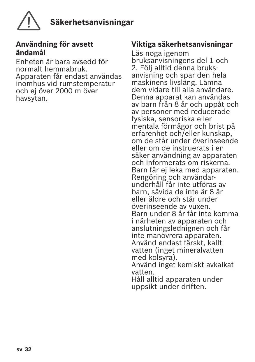 Viktiga säkerhetsanvisningar Läs noga igenom bruksanvisningens del 1 och 2. Följ alltid denna bruks anvisning och spar den hela maskinens livsläng. Lämna dem vidare till alla användare. Denna apparat kan användas av barn från 8 år och uppåt och av personer med reducerade fysiska, sensoriska eller mentala förmågor och brist på erfarenhet och/eller kunskap, om de står under överinseende eller om de instruerats i en säker användning av apparaten och informerats om riskerna. Barn får ej leka med apparaten. Rengöring och användar underhåll får inte utföras av barn, såvida de inte är 8 år eller äldre och står under överinseende av vuxen. Barn under 8 år får inte komma i närheten av apparaten och anslutningslednignen och får inte manövrera apparaten. Använd endast färskt, kallt vatten (inget mineralvatten med kolsyra). Använd inget kemiskt avkalkat vatten. Håll alltid apparaten under uppsikt under driften.