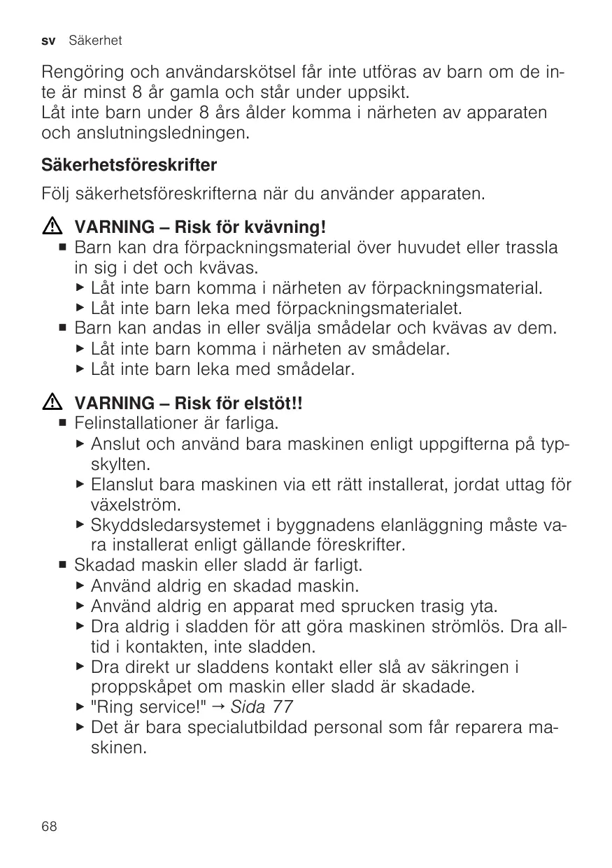 Rengöring och användarskötsel får inte utföras av barn om de inte är minst 8 år gamla och står under uppsikt. Låt inte barn under 8 års ålder komma i närheten av apparaten och anslutningsledningen. Säkerhetsföreskrifter Följ säkerhetsföreskrifterna när du använder apparaten. VARNING ‒ Risk för kvävning! ¡ Barn kan dra förpackningsmaterial över huvudet eller trassla in sig i det och kvävas. ▶ Låt inte barn komma i närheten av förpackningsmaterial. ▶ Låt inte barn leka med förpackningsmaterialet. ¡ Barn kan andas in eller svälja smådelar och kvävas av dem. ▶ Låt inte barn komma i närheten av smådelar. ▶ Låt inte barn leka med smådelar. VARNING ‒ Risk för elstöt!! ¡ Felinstallationer är farliga. ▶ Anslut och använd bara maskinen enligt uppgifterna på typskylten. ▶ Elanslut bara maskinen via ett rätt installerat, jordat uttag för växelström. ▶ Skyddsledarsystemet i byggnadens elanläggning måste vara installerat enligt gällande föreskrifter. ¡ Skadad maskin eller sladd är farligt. ▶ Använd aldrig en skadad maskin. ▶ Använd aldrig en apparat med sprucken trasig yta. ▶ Dra aldrig i sladden för att göra maskinen strömlös. Dra alltid i kontakten, inte sladden. ▶ Dra direkt ur sladdens kontakt eller slå av säkringen i proppskåpet om maskin eller sladd är skadade. ▶ "Ring service!" → Sida 77 ▶ Det är bara specialutbildad personal som får reparera maskinen.