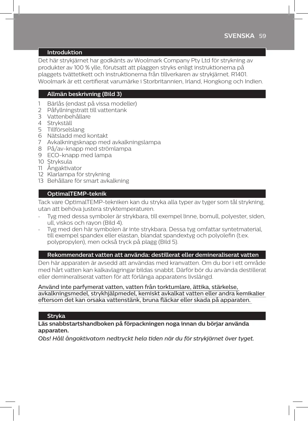 SVENSKA 59 Introduktion Det här strykjärnet har godkänts av Woolmark Company Pty Ltd för strykning av produkter av 100 % ylle, förutsatt att plaggen stryks enligt instruktionerna på plaggets tvättetikett och instruktionerna från tillverkaren av strykjärnet. R1401. Woolmark är ett certifierat varumärke i Storbritannien, Irland, Hongkong och Indien. Allmän beskrivning (Bild 3) 1 2 3 4 5 6 7 8 9 10 11 12 13