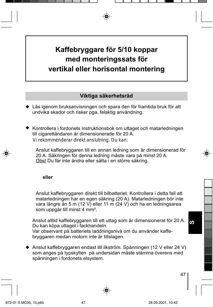 Viktiga säkerhetsråd ◆ Läs igenom bruksanvisningen och spara den för framtida bruk för att undvika skador och risker pga. felaktig användning. ◆ Kontrollera i fordonets instruktionsbok om uttaget och matarledningen till cigarettändaren är dimensionerade för 20 A. Om så inte är fallet kan du göra följande: direkt anslutning. Du kan: Vi rekommenderar Anslut kaffebryggaren till en annan ledning som är dimensionerad för 20 A. Säkringen för denna ledning måste vara på minst 20 A. Obs! Du får inte ändra eller sätta i en större säkring. eller
