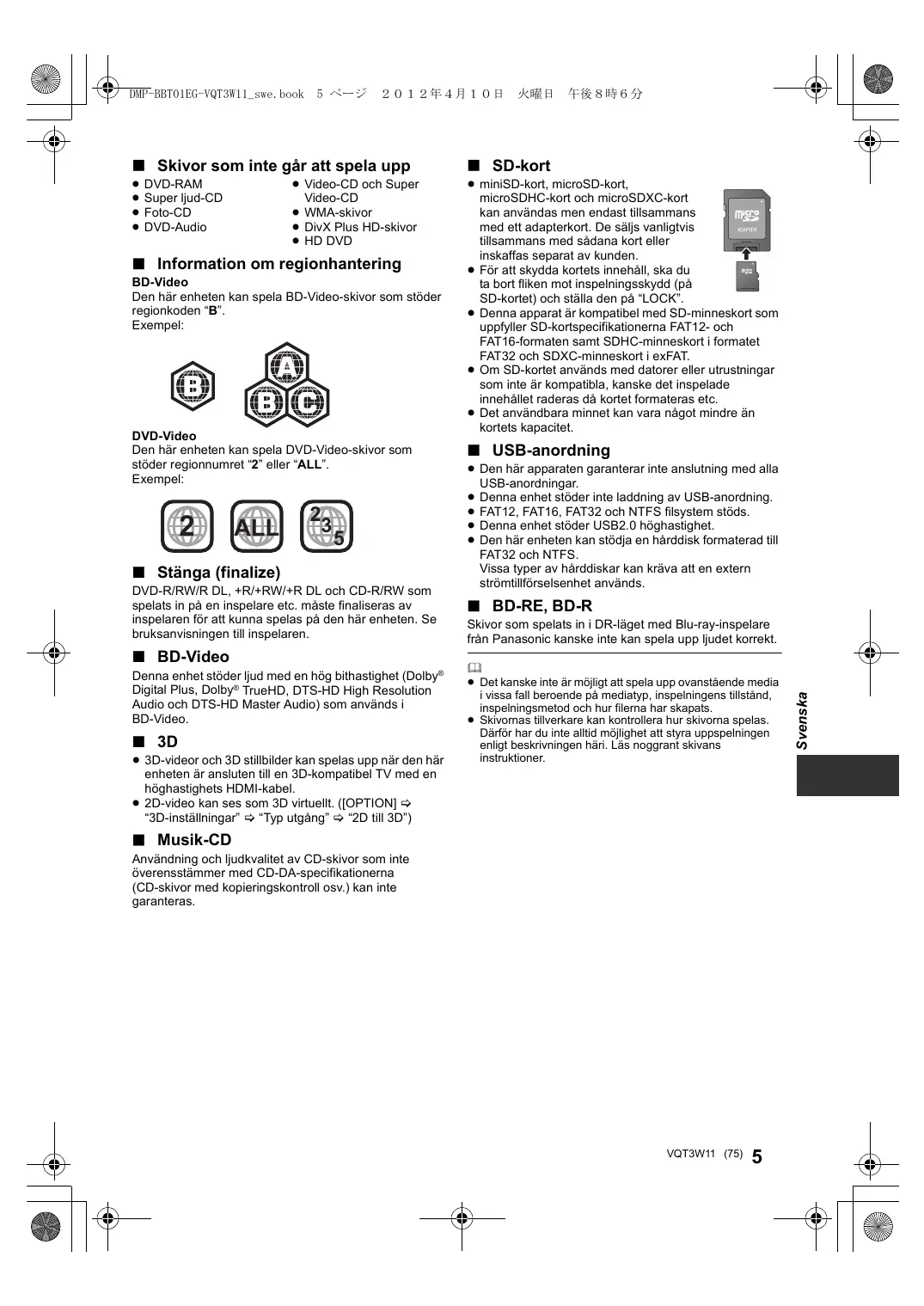 ≥ Dans certains cas, la lecture du support ci-dessus pourrait être impossible en raison du type de support, de la condition de l’enregistrement, de la méthode d’enregistrement et de la manière selon laquelle les fichiers ont été créés. ≥ Les producteurs du disque peuvent contrôler la manière dont les disques sont lus. Ainsi, vous pouvez ne pas toujours être en mesure de contrôler la lecture tel que décrite dans les présentes consignes d'utilisation. Veuillez lire attentivement les instructions relatives à l'utilisation du disque.