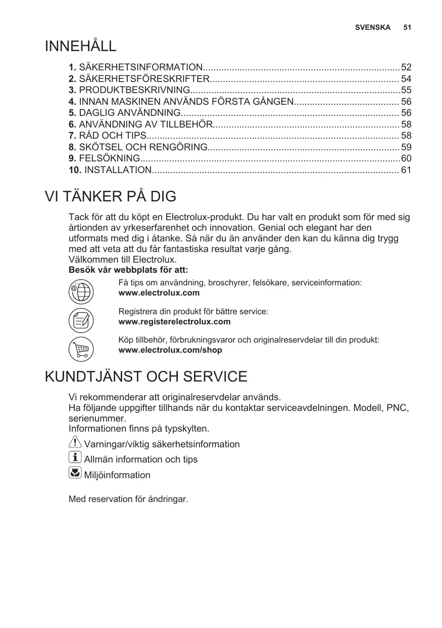 KUNDTJÄNST OCH SERVICE Vi rekommenderar att originalreservdelar används. Ha följande uppgifter tillhands när du kontaktar serviceavdelningen. Modell, PNC, serienummer. Informationen finns på typskylten. Varningar/viktig säkerhetsinformation Allmän information och tips Miljöinformation Med reservation för ändringar.