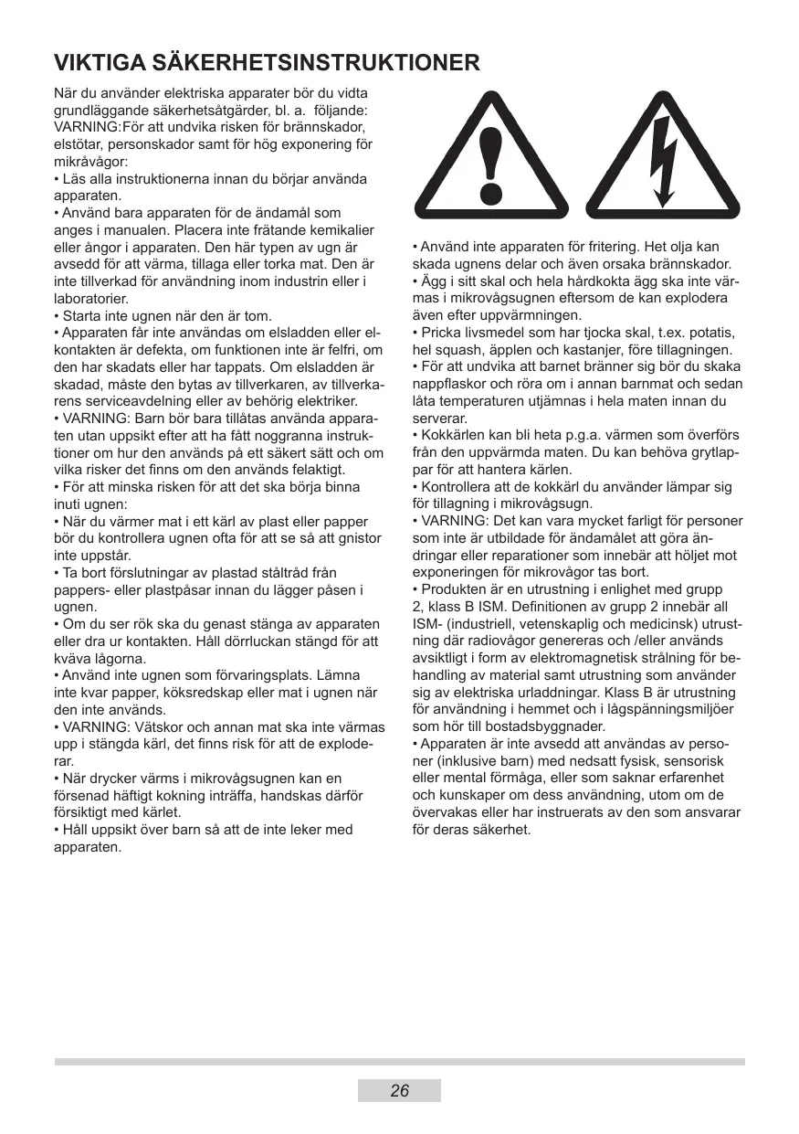- Använd bara apparaten för de ändamål som anges i manualen. Placera inte frätande kemikalier eller ångor i apparaten. Den här typen av ugn är avsedd för att värma, tillaga eller torka mat. Den är inte tillverkad för användning inom industrin eller i laboratorier.