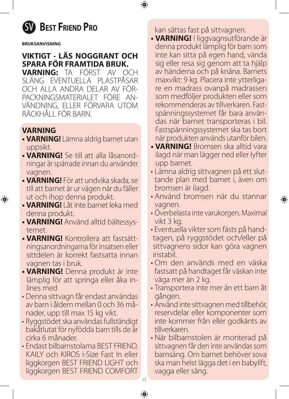 BRUKSANVISNING VIKTIGT - LÄS NOGGRANT OCH SPARA FÖR FRAMTIDA BRUK. VARNING: TA FÖRST AV OCH SLÄNG EVENTUELLA PLASTPÅSAR OCH ALLA ANDRA DELAR AV FÖRPACKNINGSMATERIALET FÖRE ANVÄNDNING, ELLER FÖRVARA UTOM RÄCKHÅLL FÖR BARN. VARNING • VARNING! Lämna aldrig barnet utan uppsikt. • VARNING! Se till att alla låsanordningar är spärrade innan du använder vagnen. • VARNING! För att undvika skada, se till att barnet är ur vägen när du fäller ut och ihop denna produkt. • VARNING! Låt inte barnet leka med denna produkt. • VARNING! Använd alltid bältessystemet. • VARNING! Kontrollera att fastsättningsanordningarna för insatsen eller sittdelen är korrekt fastsatta innan vagnen tas i bruk. • VARNING! Denna produkt är inte lämplig för att springa eller åka inlines med • Denna sittvagn får endast användas av barn i åldern mellan 0 och 36 månader, upp till max 15 kg vikt. • Ryggstödet ska användas fullständigt bakåtlutat för nyfödda barn tills de är cirka 6 månader. • Endast bilbarnstolarna BEST FRIEND, KAILY och KIROS i-Size Fast In eller liggkorgen BEST FRIEND LIGHT och liggkorgen BEST FRIEND COMFORT 77