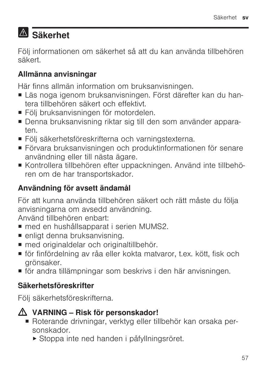 Fruchtpressenvorsatz verarbeiten1 Hinweis: Wenn Sie mit dem Fruchtpressenvorsatz arbeiten, beachten ¡ Observez la notice de l’appareil de base. ¡ Cette notice d’utilisation s’adresse à l'utilisateur de l’appareil. ¡ Respectez les consignes de sécurité et les avertissements. ¡ Conservez la notice ainsi que les informations produit en vue d’une réutilisation ultérieure ou pour un futur nouveau propriétaire. ¡ Contrôlez l’accessoire après l’avoir déballé. N’utilisez pas l’accessoire s’il a été endommagé durant le transport. Conformité d’utilisation Pour utiliser l’accessoire correctement et en toute sécurité, respectez les consignes d’utilisation conforme. Utilisez uniquement l’accessoire : ¡ avec un robot culinaire de la série MUMS2. ¡ en conformité avec la présente notice d’utilisation. ¡ avec des pièces et accessoires d’origine. ¡ pour broyer des aliments crus ou cuits, p. ex. de la viande, du poisson et des légumes. ¡ pour les autres utilisations décrites dans cette notice. Consignes de sécurité Respectez les consignes de sécurité.