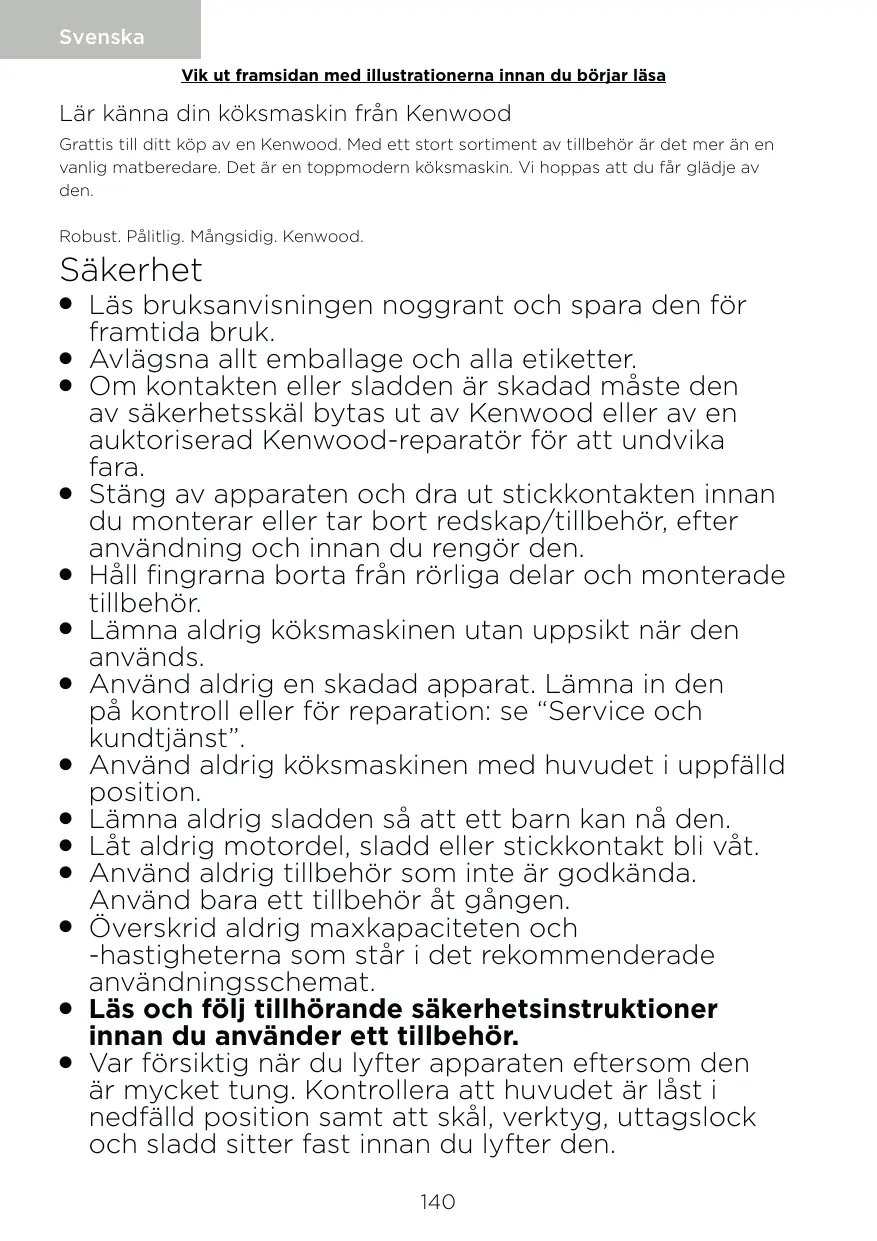 Lisez et conservez soigneusement ces instructions pour pouvoir vous y référer ultérieurement. O Retirez tous les éléments d’emballage et les étiquettes. O Si le cordon ou la prise sont endommagés, il faut les faire remplacer, pour des raisons de sécurité, par Kenwood ou un réparateur agréé par Kenwood pour éviter tout accident. O Éteignez et débranchez l'appareil avant d'installer ou de retirer les accessoires, après utilisation et avant le nettoyage. O N’approchez jamais vos doigts des éléments ou des accessoires installés en mouvement. O Ne laissez jamais le robot pâtissier multifonction sans surveillance lorsqu’il fonctionne. O N’utilisez jamais un appareil endommagé. Faites-le vérifier ou réparer : reportez-vous à la rubrique “ Service après-vente “. O Ne faites jamais fonctionner votre robot pâtissier multifonction avec la tête en position levée. O Ne laissez jamais le cordon pendre de telle façon qu’un enfant puisse s’en saisir. O Veillez à ne jamais mouiller le bloc moteur, le cordon d’alimentation ou la prise. O N’utilisez jamais un accessoire non agréé ou plus d’un seul accessoire à la fois. O Ne dépassez jamais les quantités et vitesses maximales indiquées dans le tableau d'utilisation recommandée. O Lorsque vous utilisez un accessoire, veuillez lire et suivre les consignes de sécurité qui sont fournies avec. O