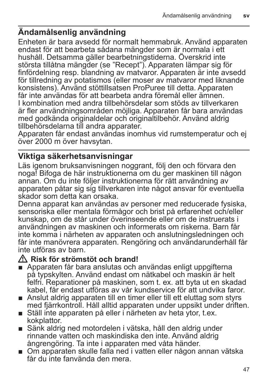 Enheten är bara avsedd för normalt hemmabruk. Använd apparaten endast för att bearbeta sådana mängder som är normala i ett hushåll. Detsamma gäller bearbetningstiderna. Överskrid inte största tillåtna mängder (se ”Recept”). Apparaten lämpar sig för finfördelning resp. blandning av matvaror. Apparaten är inte avsedd för tillredning av potatismos (eller moser av matvaror med liknande konsistens). Använd stöttillsatsen ProPuree till detta. Apparaten får inte användas för att bearbeta andra föremål eller ämnen. I kombination med andra tillbehörsdelar som stöds av tillverkaren är fler användningsområden möjliga. Apparaten får bara användas med godkända originaldelar och originaltilbehör. Använd aldrig tillbehörsdelarna till andra apparater. Apparaten får endast användas inomhus vid rumstemperatur och ej över 2000 m över havsytan.