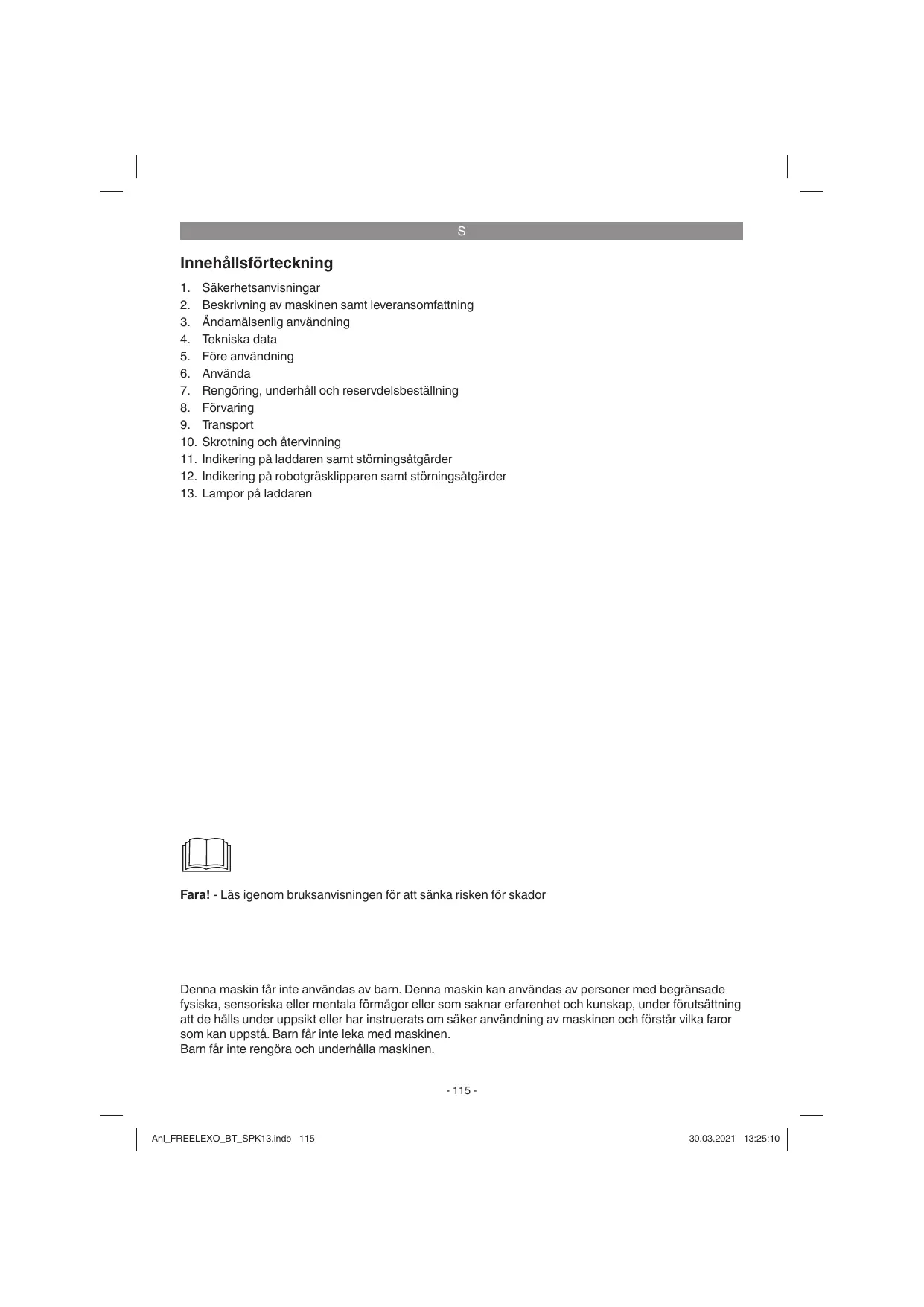 L’appareil et le matériel d’emballage ne sont pas des jouets ! Il est interdit de laisser des enfants jouer avec des sacs et des films en plastique et avec des pièces de petite taille. Ils risquent de les avaler et de s’étouffer ! Contenu de la livraison, matériel de montage et accessoires (certains ne sont pas compris) : Pour connaître le contenu de la livraison, veuillez vous référer à la fiche d’information jointe correspondante. • Tondeuse robot • (Câble de) bloc d‘alimentation • Station de recharge • Vis de fixation (4 pièces) • Lames de rechange • Crochet de fixation • Fil de délimitation • Connecteur de câble • Clé allen • Accumulateur • Chargeur La tondeuse robot convient à un usage privé dans le jardin domestique et familial et est exclusivement destinée à la tonte de surfaces de gazon. La machine doit être exclusivement utilisée conformément à son affectation. Toute utilisation allant au-delà de cette affectation est considérée