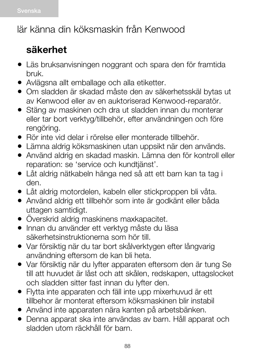 Läs bruksanvisningen noggrant och spara den för framtida bruk. Avlägsna allt emballage och alla etiketter. Om sladden är skadad måste den av säkerhetsskäl bytas ut av Kenwood eller av en auktoriserad Kenwood-reparatör. Stäng av maskinen och dra ut sladden innan du monterar eller tar bort verktyg/tillbehör, efter användningen och före rengöring. Rör inte vid delar i rörelse eller monterade tillbehör. Lämna aldrig köksmaskinen utan uppsikt när den används. Använd aldrig en skadad maskin. Lämna den för kontroll eller reparation: se ‘service och kundtjänst’. Låt aldrig nätkabeln hänga ned så att ett barn kan ta tag i den. Låt aldrig motordelen, kabeln eller stickproppen bli våta. Använd aldrig ett tillbehör som inte är godkänt eller båda uttagen samtidigt. Överskrid aldrig maskinens maxkapacitet. Innan du använder ett verktyg måste du läsa säkerhetsinstruktionerna som hör till. Var försiktig när du tar bort skålverktygen efter långvarig användning eftersom de kan bli heta. Var försiktig när du lyfter apparaten eftersom den är tung Se till att huvudet är låst och att skålen, redskapen, uttagslocket och sladden sitter fast innan du lyfter den. Flytta inte apparaten och fäll inte upp mixerhuvud är ett tillbehor är monterat eftersom köksmaskinen blir instabil Använd inte apparaten nära kanten på arbetsbänken. Denna apparat ska inte användas av barn. Håll apparat och sladden utom räckhåll för barn. 88
