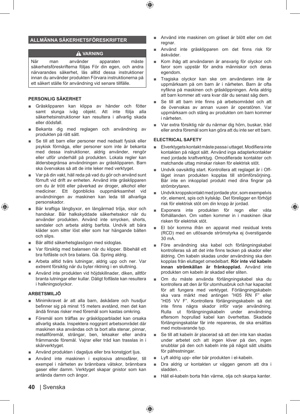 Bär ögonskydd Använd inte i sluttningar som är brantare lQÛ.OLSSOlQJVWPHGVOXWWQLQJDU aldrig uppåt eller nedåt. Utsätt inte för regn eller våta omgivningar. Var försiktig med vassa blad. Bladen fortsätter att rotera när motorn har stängts av – Ta ur kontakten ur eluttaget före underhåll eller om kabeln är skadad. 6HXSSPHGNULQJNDVWDGHHOOHUÀ\JDQGH föremål. Håll alla personer i närheten (speciellt barn och djur) minst 15 m bort från arbetsområdet. Håll elkabeln borta från skärbladen.