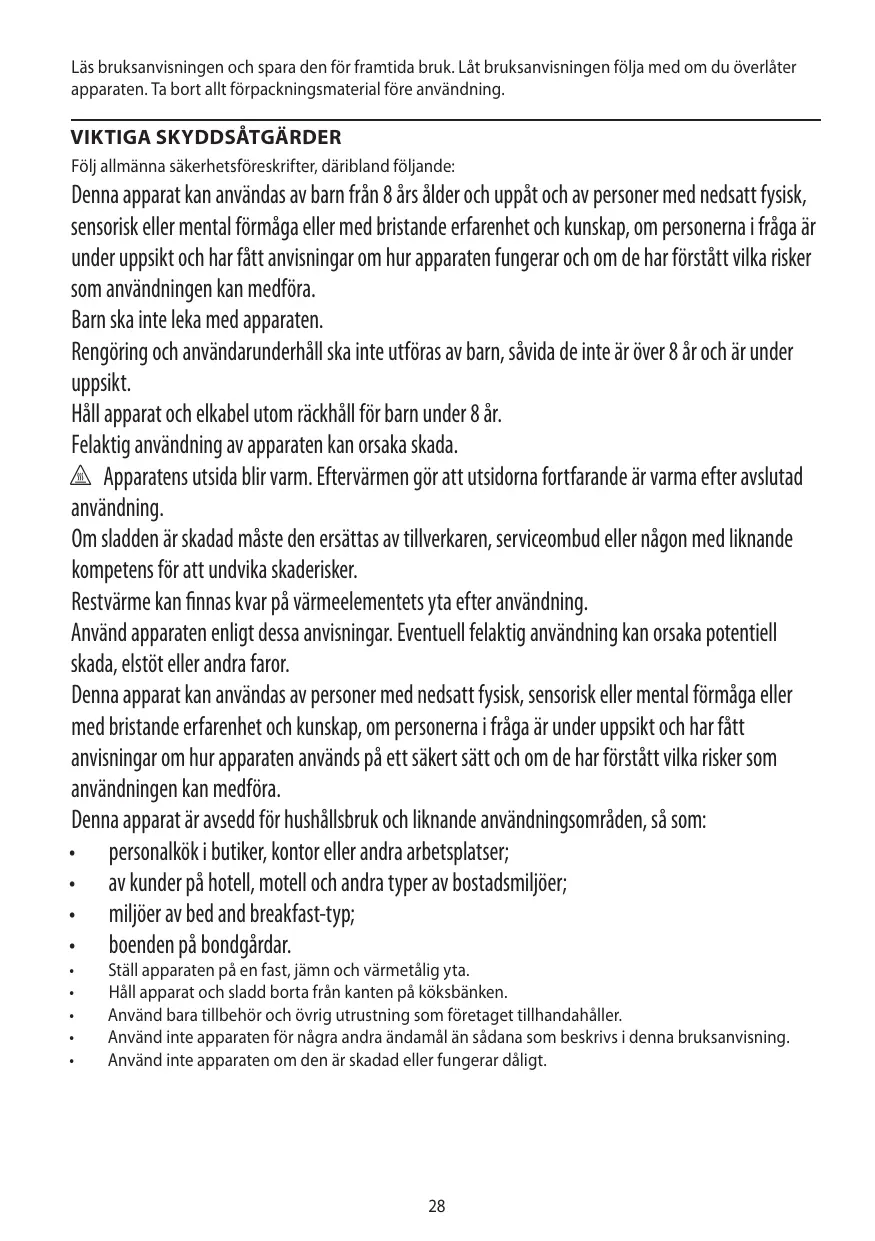 Denna apparat kan användas av barn från 8 års ålder och uppåt och av personer med nedsatt fysisk, sensorisk eller mental förmåga eller med bristande erfarenhet och kunskap, om personerna i fråga är under uppsikt och har fått anvisningar om hur apparaten fungerar och om de har förstått vilka risker som användningen kan medföra. Barn ska inte leka med apparaten. Rengöring och användarunderhåll ska inte utföras av barn, såvida de inte är över 8 år och är under uppsikt. Håll apparat och elkabel utom räckhåll för barn under 8 år. Felaktig användning av apparaten kan orsaka skada. h Apparatens utsida blir varm. Eftervärmen gör att utsidorna fortfarande är varma efter avslutad användning. Om sladden är skadad måste den ersättas av tillverkaren, serviceombud eller någon med liknande kompetens för att undvika skaderisker. Restvärme kan finnas kvar på värmeelementets yta efter användning. Använd apparaten enligt dessa anvisningar. Eventuell felaktig användning kan orsaka potentiell skada, elstöt eller andra faror. Denna apparat kan användas av personer med nedsatt fysisk, sensorisk eller mental förmåga eller med bristande erfarenhet och kunskap, om personerna i fråga är under uppsikt och har fått anvisningar om hur apparaten används på ett säkert sätt och om de har förstått vilka risker som användningen kan medföra. Denna apparat är avsedd för hushållsbruk och liknande användningsområden, så som: • personalkök i butiker, kontor eller andra arbetsplatser; • av kunder på hotell, motell och andra typer av bostadsmiljöer; • miljöer av bed and breakfast-typ; • boenden på bondgårdar. • • • • •