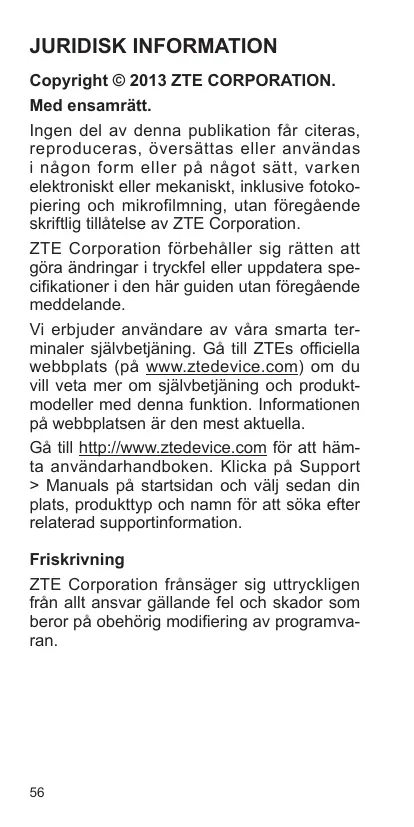 JURIDISK INFORMATION Copyright © 2013 ZTE CORPORATION. Med ensamrätt. Ingen del av denna publikation får citeras, reproduceras, översättas eller användas i någon form eller på något sätt, varken elektroniskt eller mekaniskt, inklusive fotokopiering och mikrofilmning, utan föregående skriftlig tillåtelse av ZTE Corporation. ZTE Corporation förbehåller sig rätten att göra ändringar i tryckfel eller uppdatera specifikationer i den här guiden utan föregående meddelande. Vi erbjuder användare av våra smarta terminaler självbetjäning. Gå till ZTEs officiella webbplats (på www.ztedevice.com) om du vill veta mer om självbetjäning och produktmodeller med denna funktion. Informationen på webbplatsen är den mest aktuella. Gå till http://www.ztedevice.com för att hämta användarhandboken. Klicka på Support > Manuals på startsidan och välj sedan din plats, produkttyp och namn för att söka efter relaterad supportinformation. Friskrivning ZTE Corporation frånsäger sig uttryckligen från allt ansvar gällande fel och skador som beror på obehörig modifiering av programvaran.