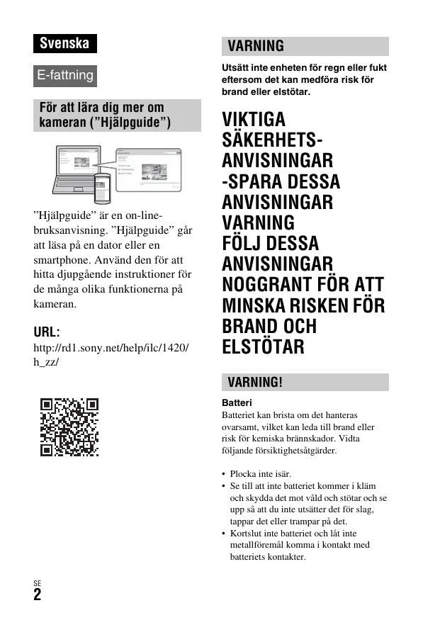 • Utsätt inte batteriet för temperaturer som