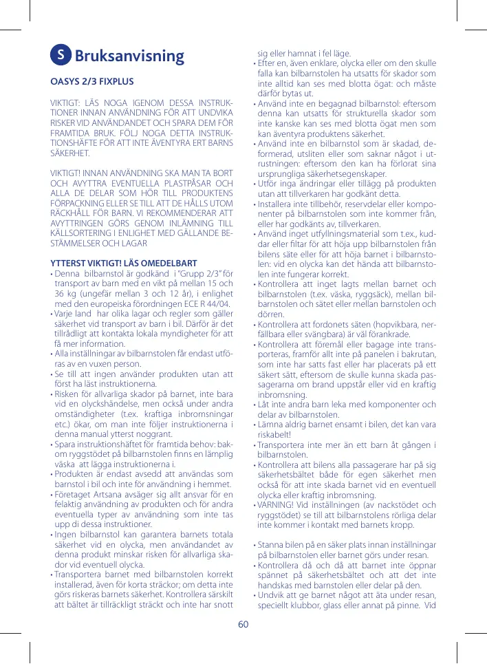 LIRE ATTENTIVEMENT ET ENTIÈREMENT CETTE NOTICE POUR ÉVITER TOUT DANGER ET LA CONSERVER POUR TOUTE RÉFÉRENCE FUTURE. POUR NE PAS COMPROMETTRE LA SÉCURITÉ DE VOTRE ENFANT, SUIVEZ ATTENTIVEMENT CES INSTRUCTIONS. ATTENTION ! AVANT D’UTILISER LE PRODUIT, ÔTER ET ÉLIMINER TOUS LES SACHETS EN PLASTIQUE ÉVENTUELS ET TOUS LES ÉLÉMENTS COMPOSANT L’EMBALLAGE DU PRODUIT ET LES TENIR HORS DE PORTÉE DES ENFANTS. IL EST CONSEILLÉ D’ÉLIMINER CES ÉLÉMENTS EN FAISANT LE TRI SÉLECTIF CONFORMÉMENT AUX LOIS EN VIGUEUR. TRÈS IMPORTANT ! À LIRE IMMÉDIATEMENT • Ce siège-auto est homologué “Groupe 2/3”, pour le transport d’enfants de 15 à 36 Kg (de 3 à 12 ans de façon indicative), conformément au règlement européen ECE R 44/04. • Chaque pays applique des lois et des règlements différents en matière de sécurité pour le transport des enfants en voiture. C’est pourquoi il est conseillé de contacter les autorités locales pour obtenir davantage d’informations. • Les activités de réglage du siège-auto doivent être effectuées exclusivement par un adulte. • Éviter que quiconque utilise le produit sans avoir lu la notice. • Le risque de blessures de l’enfant, non seulement en cas d’accident mais aussi dans d’autres circonstances (par ex. freinages brusques, etc.) augmente si les indications de cette notice ne sont pas suivies scrupuleusement. • Conserver la Notice pour toute référence future : une poche permettant de ranger la notice se trouve derrière le dossier du siège auto. • Le produit doit être utilisé exclusivement comme siège-auto et ne doit pas être utilisé à la maison. • La société Artsana décline toute responsabilité en cas d’utilisation incorrecte du produit et pour toute utilisation différente de cette notice. • Aucun siège-auto ne peut garantir la sécurité totale de l’enfant en cas d’accident, mais son utilisation réduit le risque de blessures graves. • Transporter un enfant dans un siège-auto correctement installé, même lors de trajets brefs ; dans le cas contraire, cela pourrait nuire à sa sécurité. Vérifier notamment que la ceinture est correcte-