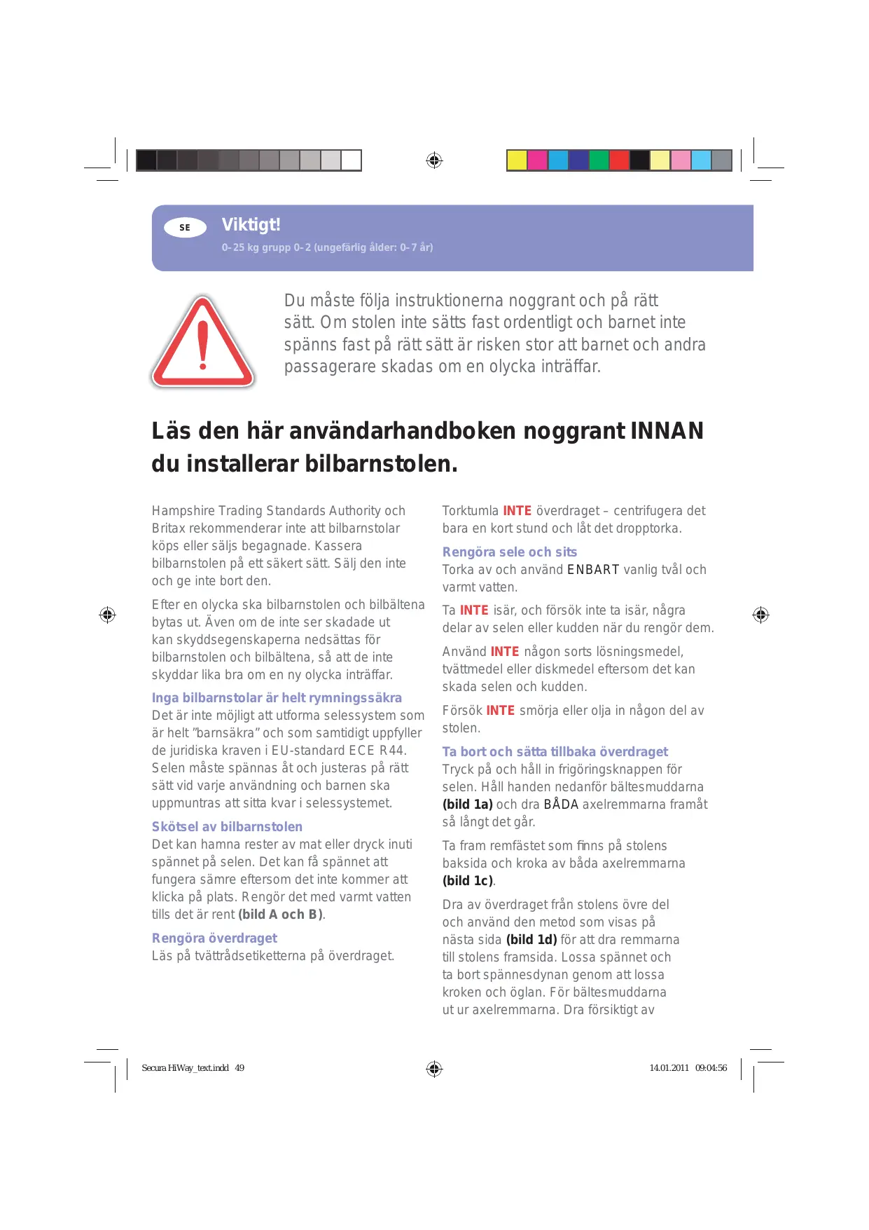 Läs den här användarhandboken noggrant INNAN du installerar bilbarnstolen. Hampshire Trading Standards Authority och Britax rekommenderar inte att bilbarnstolar köps eller säljs begagnade. Kassera bilbarnstolen på ett säkert sätt. Sälj den inte och ge inte bort den.