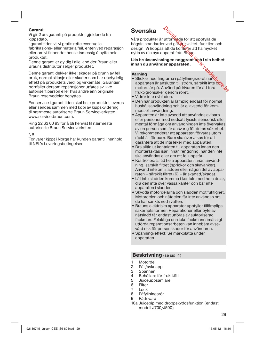 Varning • Stick ej ned fingrarna i påfyllningsröret när apparaten är ansluten till ström, särskilt inte om motorn är på. Använd pådrivaren för att föra frukt/grönsaker genom röret. • Vidrör inte rivbladen. • Den här produkten är lämplig endast för normal hushållsanvändning och är ej avsedd för kommersiell användning. • Apparaten är inte avsedd att användas av barn eller personer med nedsatt fysisk, sensorisk eller mental förmåga om användningen inte övervakas av en person som är ansvarig för deras säkerhet. Vi rekommenderar att apparaten förvaras utom räckhåll för barn. Barn ska övervakas för att garantera att de inte leker med apparaten. • Dra alltid ut kontakten till apparaten innan den monteras/tas isär, innan rengöring, när den inte ska användas eller om ett fel uppstår. • Kontrollera alltid hela apparaten innan användning, särskilt filtret (sprickor och skavanker). Använd inte om sladden eller någon del av apparaten – särskilt filtret (6) – är skadad/skadat. • Låt inte sladden komma i kontakt med heta delar, dra den inte över vassa kanter och bär inte apparaten i sladden. • Skydda motordelarna och sladden mot fuktighet. Motordelen och nätdelen får inte användas om de har sänkts ned i vatten. • Brauns elektriska apparater uppfyller tillämpliga säkerhetsnormer. Reparationer eller byte av nätsladd får endast utföras av auktoriserad fackman. Felaktiga och icke fackmannamässigt utförda reparationsarbeten kan innebära avsevärd risk för personskador för användaren. • Spänning/effekt: Se märkplatta under apparaten.