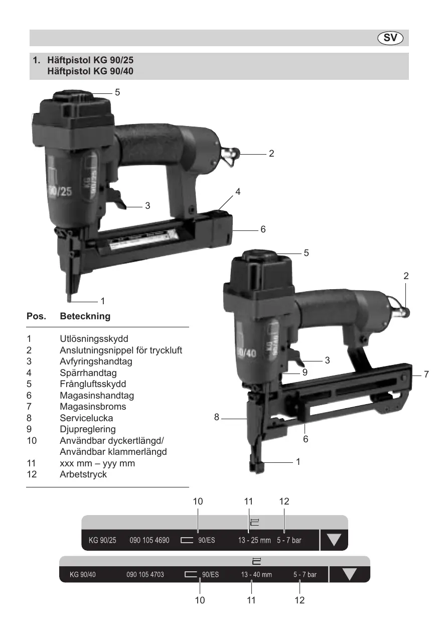 Häftpistolen kan användas fôr att driva in häftklammer med 5,8 mm bredd och 15 - 25 mm längd (typ KG 90/25) och 15 - 40 mm (typ KG 90/40) med en trädtjocklek pà 1,25 x 1,00 mm.