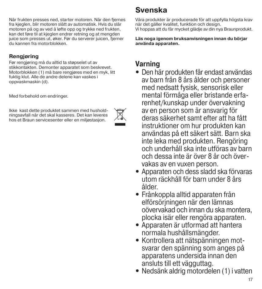 Varning • Den här produkten får endast användas av barn från 8 års ålder och personer med nedsatt fysisk, sensorisk eller mental förmåga eller bristande erfarenhet/kunskap under övervakning av en person som är ansvarig för deras säkerhet samt efter att ha fått instruktioner om hur produkten kan användas på ett säkert sätt. Barn ska inte leka med produkten. Rengöring och underhåll ska inte utföras av barn och dessa inte är över 8 år och övervakas av en vuxen person. • Apparaten och dess sladd ska förvaras utom räckhåll för barn under 8 års ålder. • Frånkoppla alltid apparaten från elförsörjningen när den lämnas oövervakad och innan du ska montera, plocka isär eller rengöra apparaten. • Apparaten är utformad att hantera normala hushållsmängder. • Kontrollera att nätspänningen motsvarar den spänning som anges på apparatens undersida innan den ansluts till ett vägguttag. • Nedsänk aldrig motordelen (1) i vatten 17
