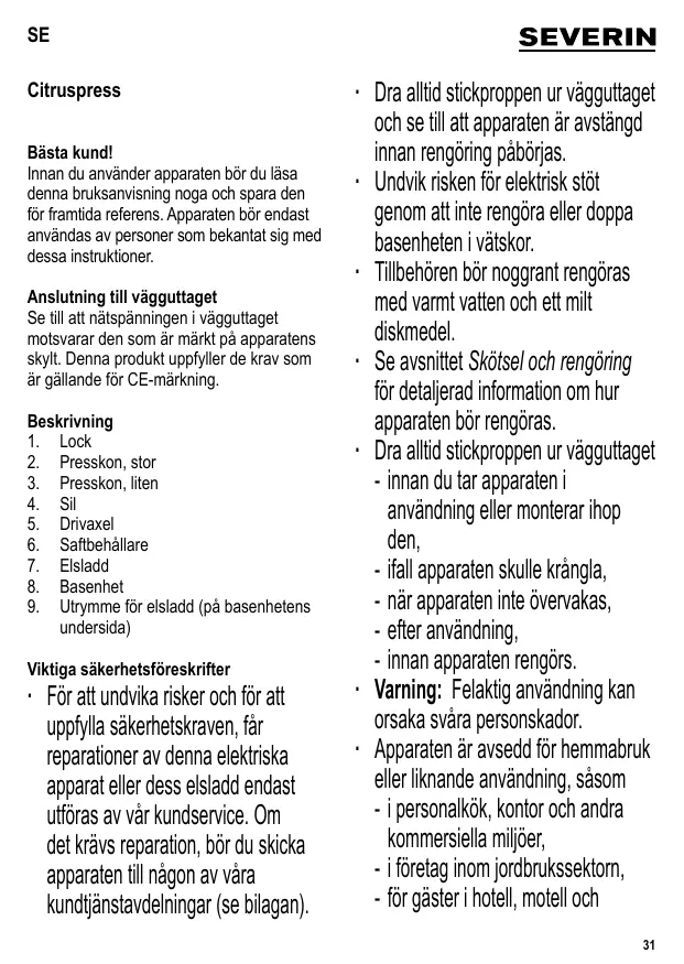Citruspress Bästa kund! Innan du använder apparaten bör du läsa denna bruksanvisning noga och spara den för framtida referens. Apparaten bör endast användas av personer som bekantat sig med dessa instruktioner. Anslutning till vägguttaget Se till att nätspänningen i vägguttaget motsvarar den som är märkt på apparatens skylt. Denna produkt uppfyller de krav som är gällande för CE-märkning. Beskrivning