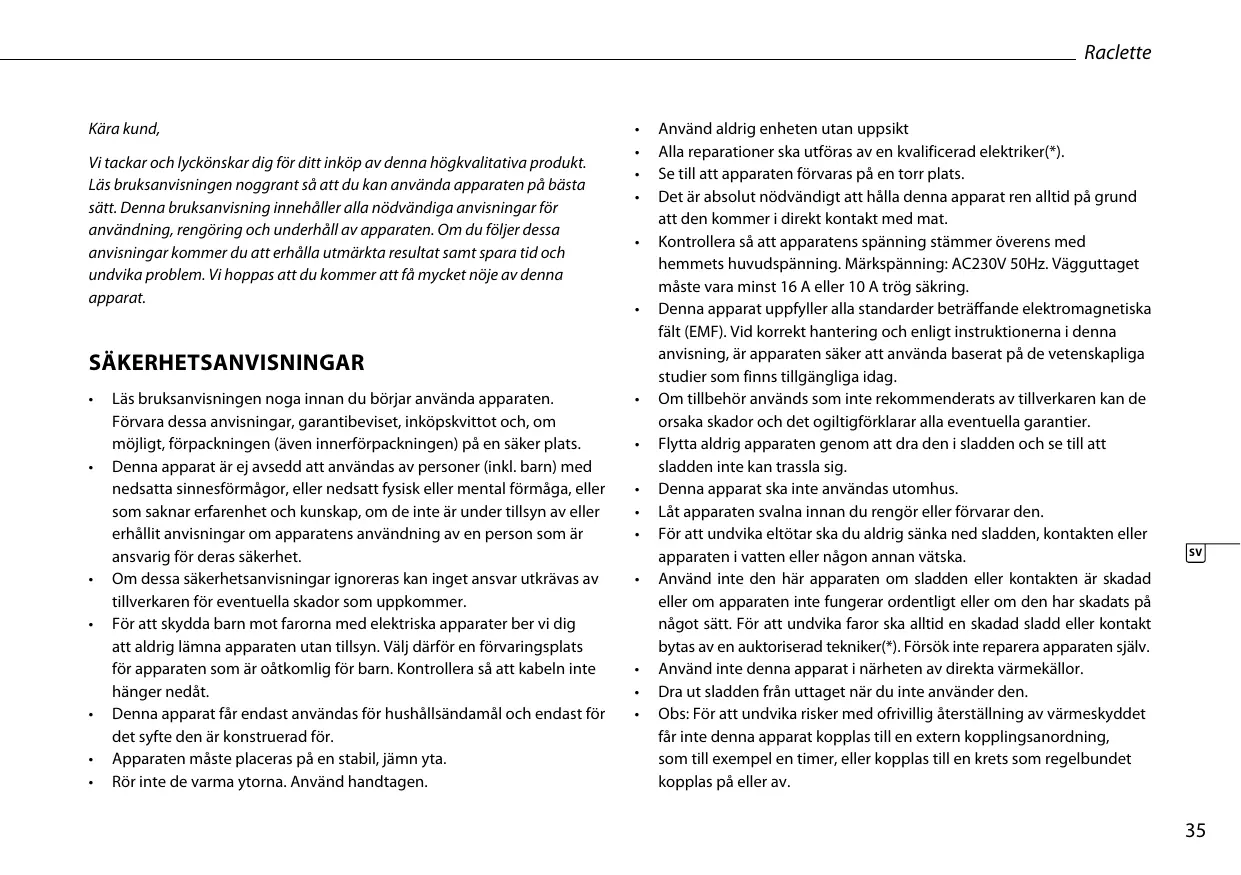 Il faut impérativement que cet appareil demeure propre car il est en contact direct avec des aliments. Vérifiez si la tension de l'appareil correspond à la tension du secteur de votre domicile. Tension nominale : 230V CA 50Hz. La prise doit être d’au moins 16A ou 10A et à fusible lent. Cet appareil est conforme à toutes les normes relatives aux champs électromagnétiques (CEM). D’après les preuves scientifiques disponibles à ce jour, cet appareil est sans danger à l’utilisation, à condition qu’il soit utilisé de manière correcte et en respectant les consignes de cette notice d’emploi. L’utilisation d’accessoires qui ne sont pas recommandés par le fabricant peut entrainer des blessures et annulera toutes garanties en votre possession. Ne jamais déplacer l’appareil en tirant sur le cordon et veillez à ce que ce dernier ne devienne pas entortillé. Ne pas utiliser cet appareil à l’extérieur. Laissez refroidir l’appareil avant de le nettoyer ou de le ranger. Ne pas immerger le cordon, la prise ou l'appareil dans de l'eau ou autre liquide afin de vous éviter un choc électrique. Ne pas utiliser cet appareil avec un cordon ou une prise endommagés ou s’il ne fonctionne pas correctement, ou a subi des dégâts quelconques. Afin d’éviter tous dangers, veillez à ce qu’un cordon ou prise endommagés soient remplacés par un technicien agréé (*). Ne réparez pas vous-même cet appareil. Ne pas utiliser cet appareil à proximité de sources de chaleur directe. Débranchez l’appareil de la prise lorsqu’il n’est pas utilisé.