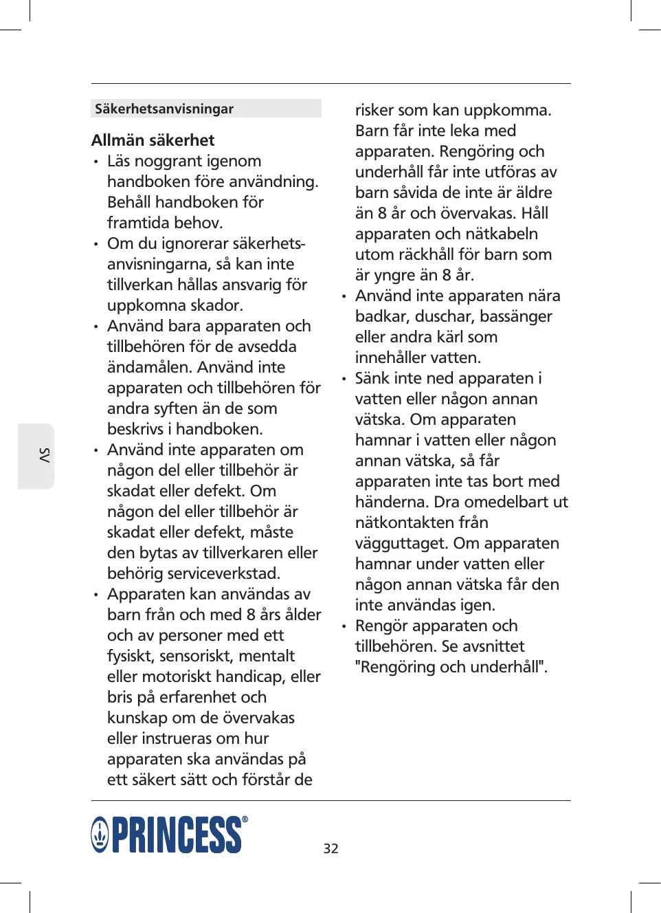 SV Allmän säkerhet • Läs noggrant igenom handboken före användning. Behåll handboken för framtida behov. • Om du ignorerar säkerhets anvisningarna, så kan inte tillverkan hållas ansvarig för uppkomna skador. • Använd bara apparaten och tillbehören för de avsedda ändamålen. Använd inte apparaten och tillbehören för andra syften än de som beskrivs i handboken. • Använd inte apparaten om någon del eller tillbehör är skadat eller defekt. Om någon del eller tillbehör är skadat eller defekt, måste den bytas av tillverkaren eller behörig serviceverkstad. • Apparaten kan användas av barn från och med 8 års ålder och av personer med ett fysiskt, sensoriskt, mentalt eller motoriskt handicap, eller bris på erfarenhet och kunskap om de övervakas eller instrueras om hur apparaten ska användas på ett säkert sätt och förstår de